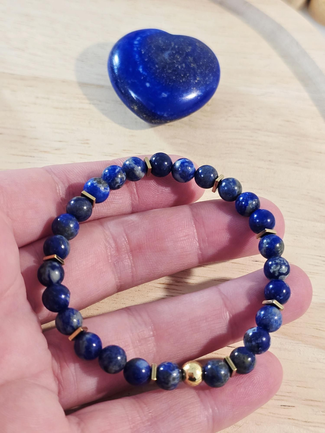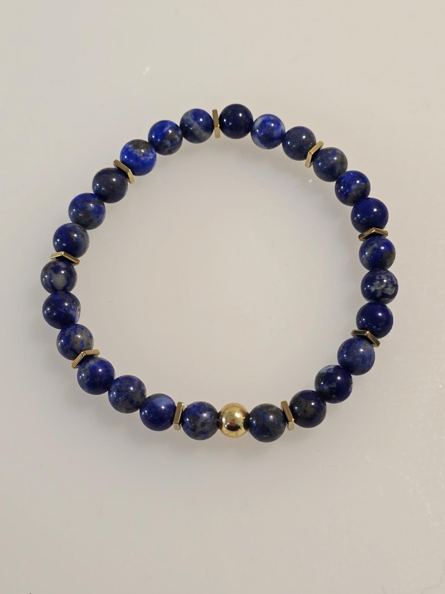 Bracelet fait main sur fil élastique solide composé de Lapis lazuli en 0,6 cm ainsi que de perles en hématite plaquée et acier inoxydable.