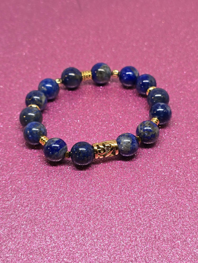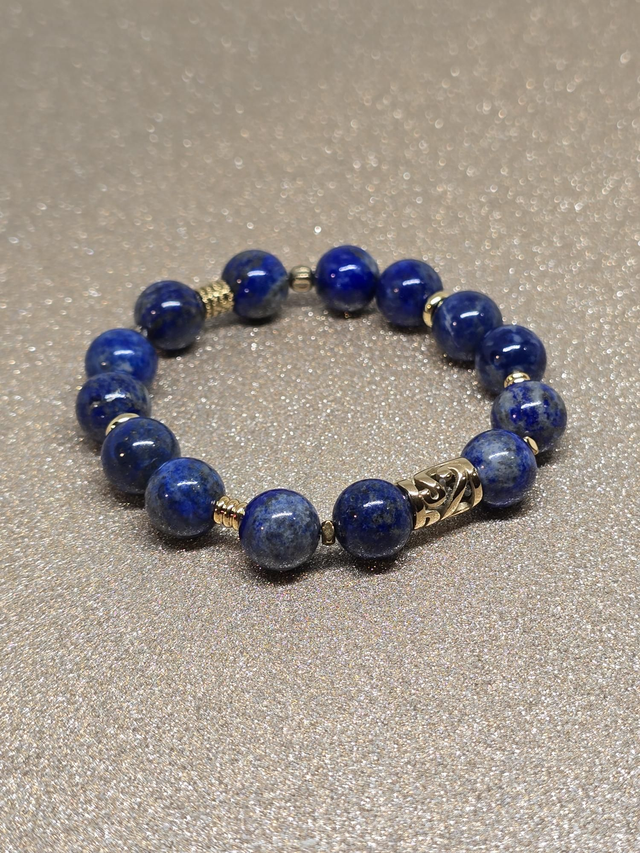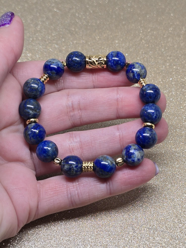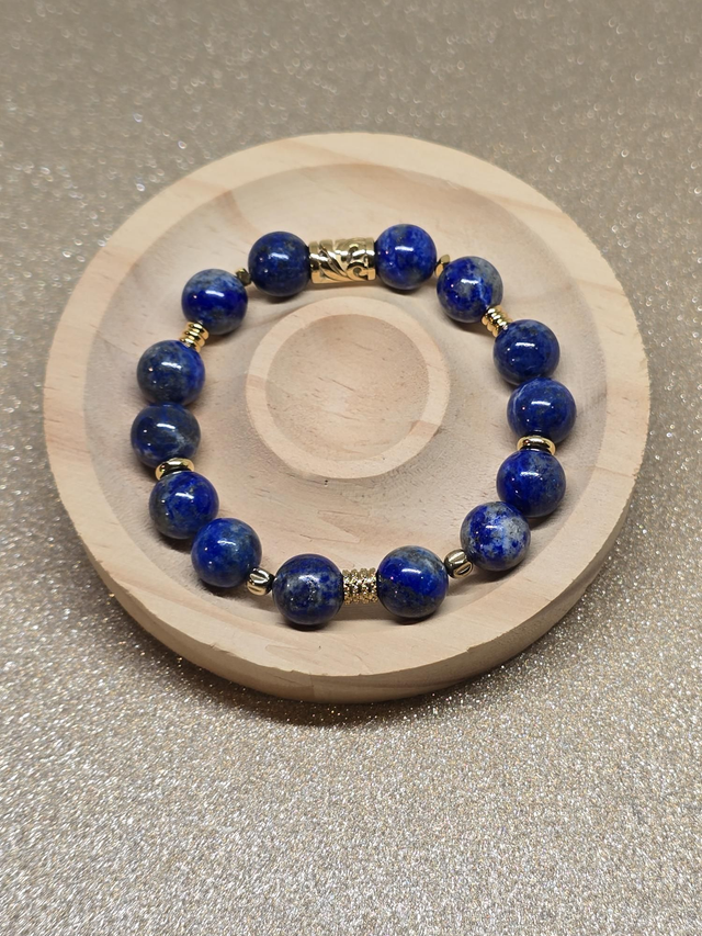 ✨Bracelet fait main sur fil élastique solide composé de Lapis lazuli en 1 cm ainsi que de perles plaquées et acier inoxydable doré.