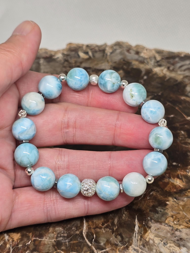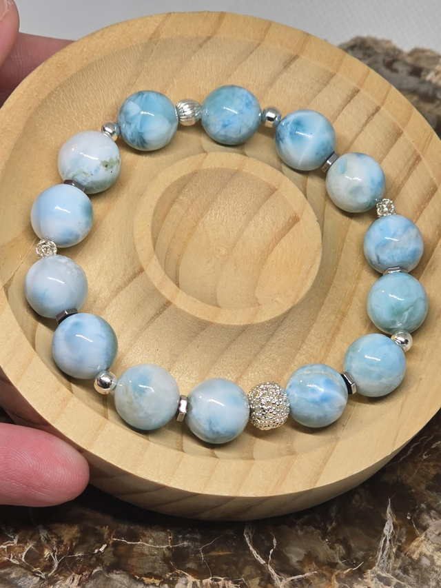 Larimar : chakra de la gorge (bleu clair), apporte équilibre, apaisement, encourage à surmonter les difficultés de la vie, à s’épanouir, à devenir agréable et positif, à faire preuve d’un état d’esprit optimiste et permet de relativiser la négativité. Diffuse la joie, la sérénité et le bien-être. Cette une pierre de résilience.