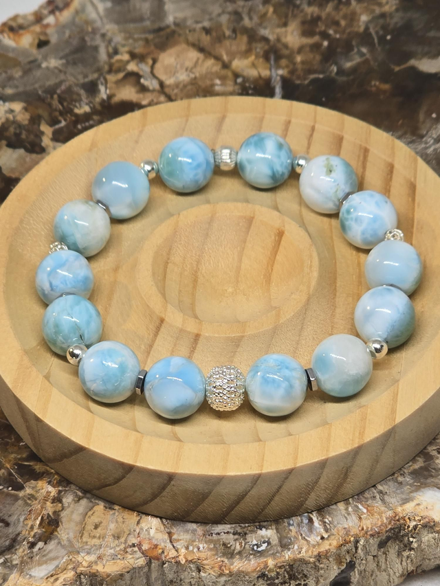 Bracelet fait main sur fil élastique solide composé de Larimar XL en 1,2 cm à ainsi que de perles en hématite plaquée et argent 925.