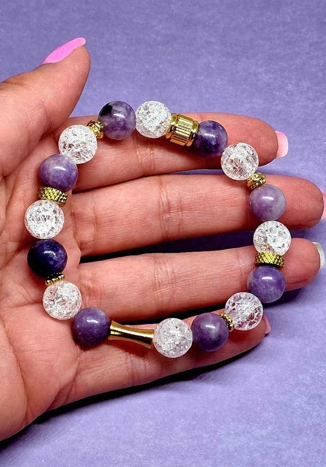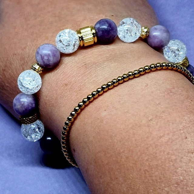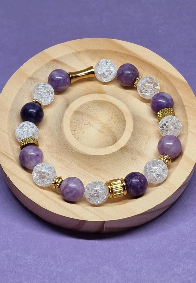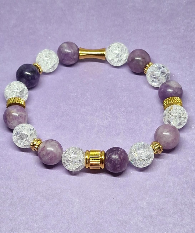 ✨ Bracelet fait main sur fil élastique solide, composé de Lépidolite et Cristal de roche craquelé en 1 cm ainsi que de perles dorées à l'or fin et acier inoxydable doré.