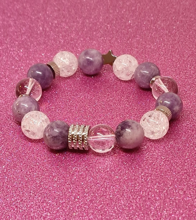 Bracelet fait main sur fil élastique solide composé de Lépidolite et Cristal de roche XL en 1,2 cm ainsi que de perles en acier inoxydable