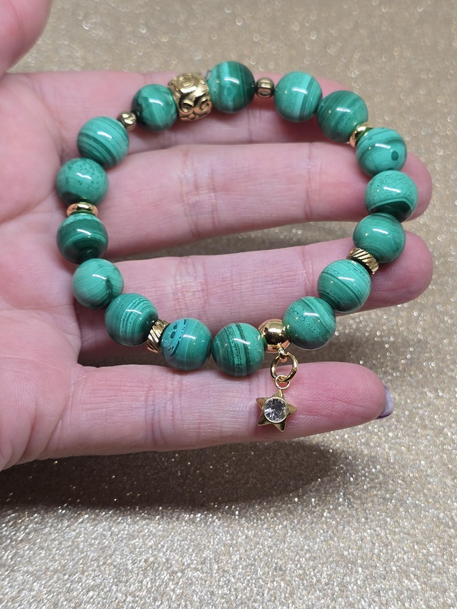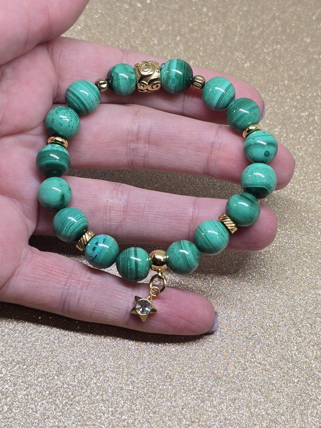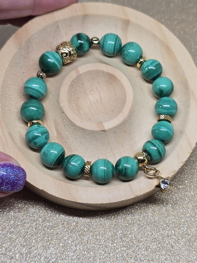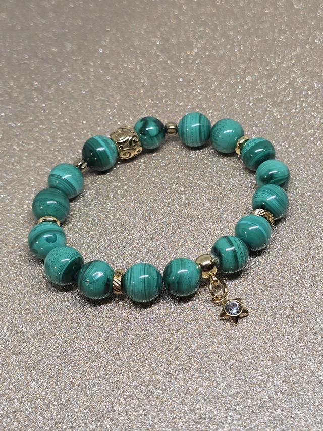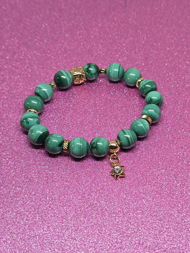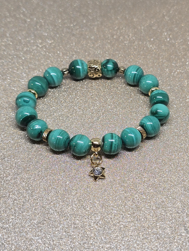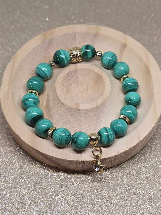 ✨Bracelet fait main sur fil élastique solide composé de Malachite en 1 cm ainsi que de perles plaquées et acier inoxydable.