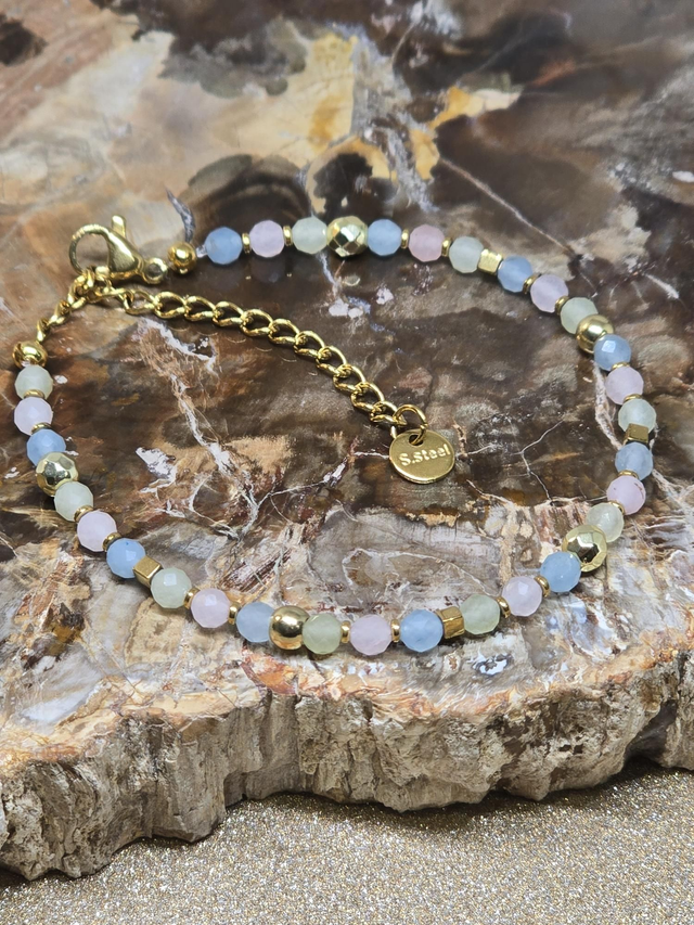 Bracelet fait main sur fil fixe et taille ajustable, avec pierres naturelles, chaînette d'extension de 5 cm en acier inoxydable et perles en hématite plaqué et acier inoxydable.