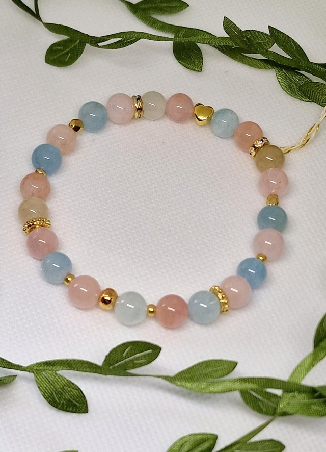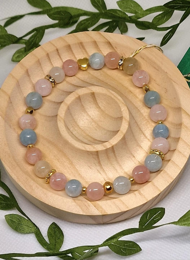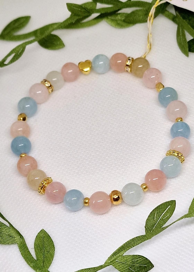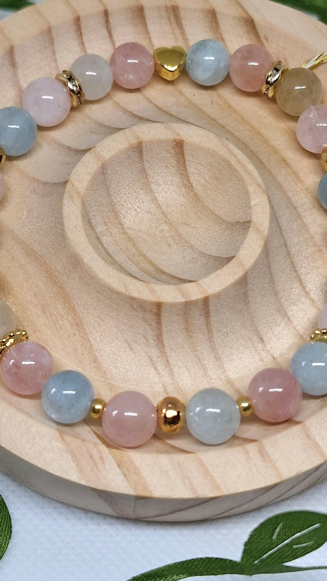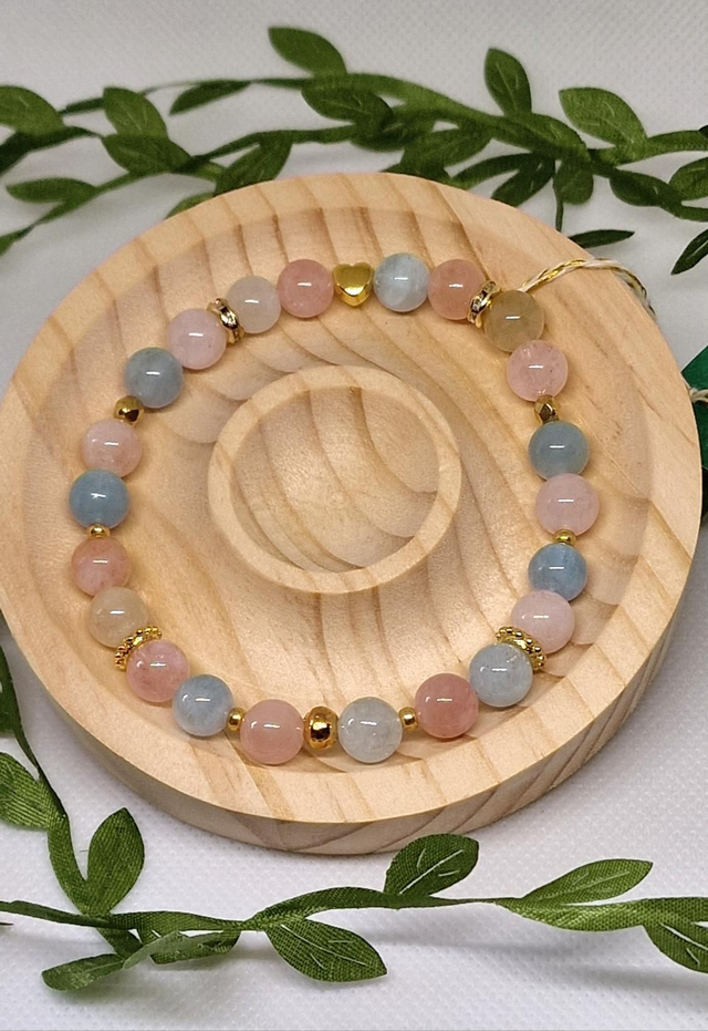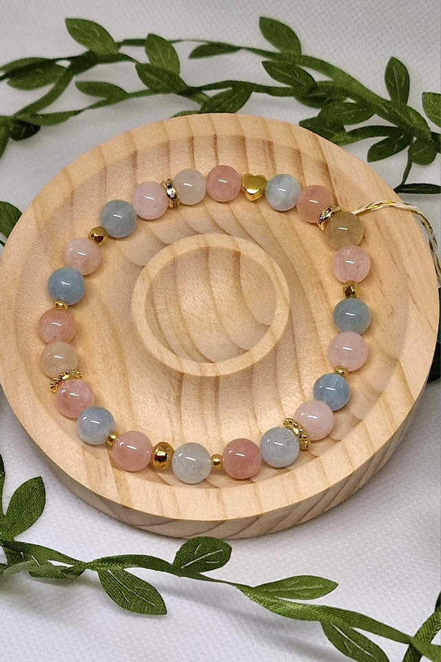 Bracelet fait main sur fil élastique solide, composé de Morganite en 0,8 cm ainsi que de perles dorées à l'or fin.