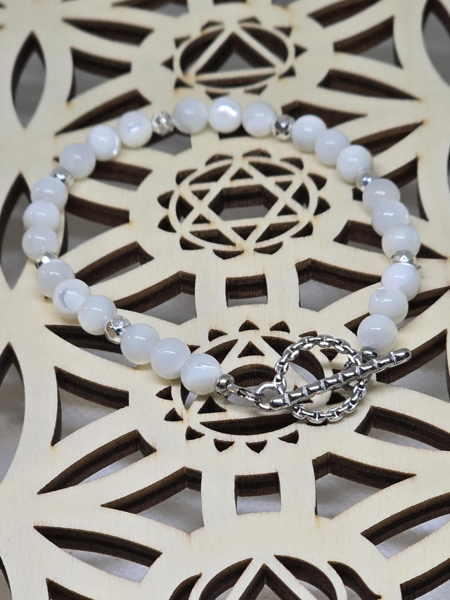 Nacre : chakra coronal (blanc). Douceur, pureté, féminité, bien-être. Polyvalente, elle possède des propriétés apaisantes, équilibrantes et protectrices. Elle rééquilibre la circulation énergétique entre le corps et l'esprit, favorisant ainsi la santé. Elle aide à accéder à la sagesse et à une meilleure maitrise de soi. Évitez le contact avec l'eau.