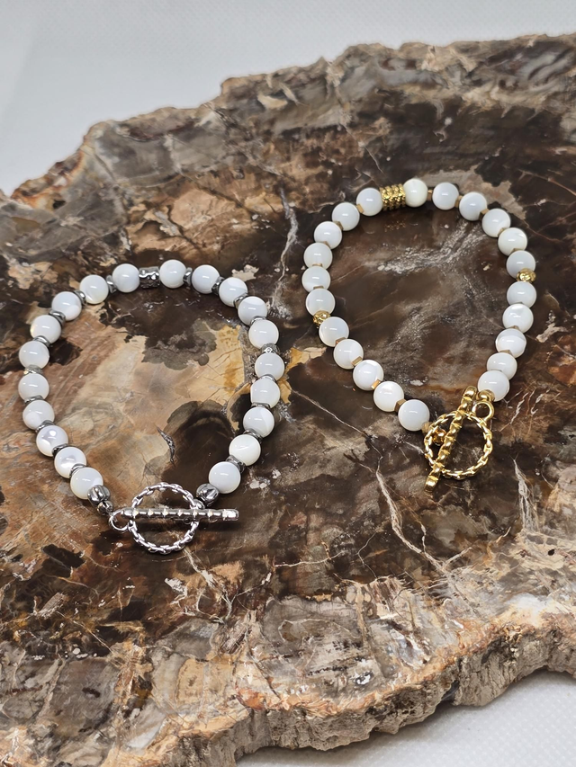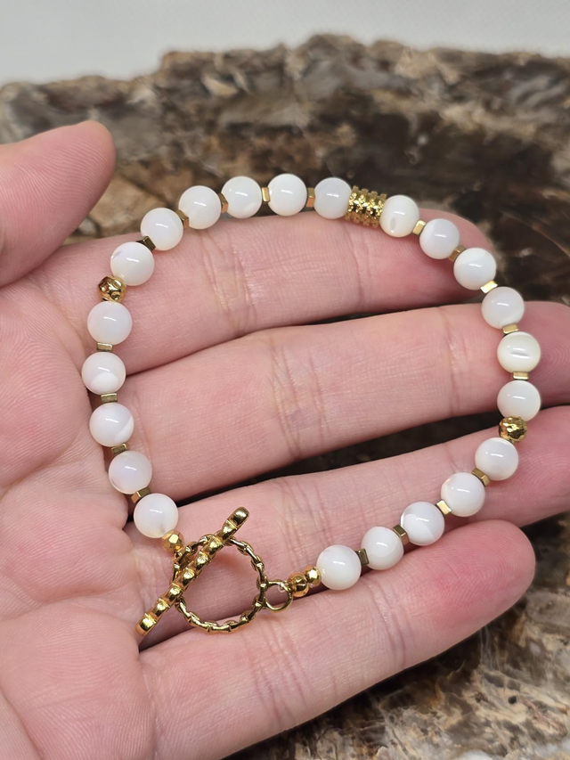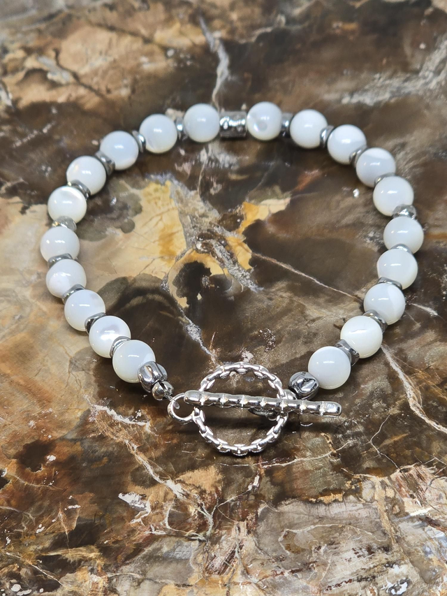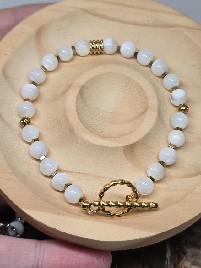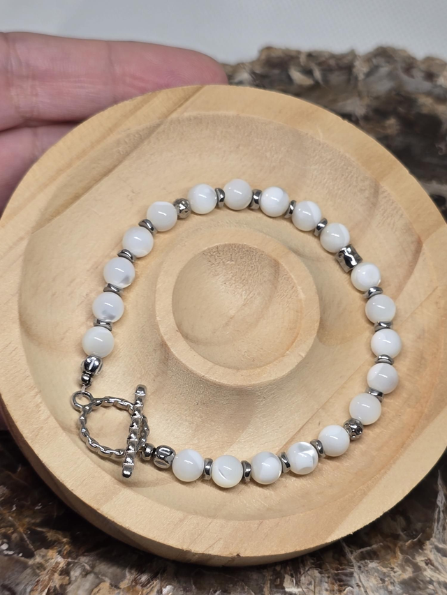 Bracelet fait main sur fil fixe avec fermoir en T en acier inoxydable, composé de Nacre en 0,6 cm ainsi que de perles en hématite plaquées et acier inoxydable.