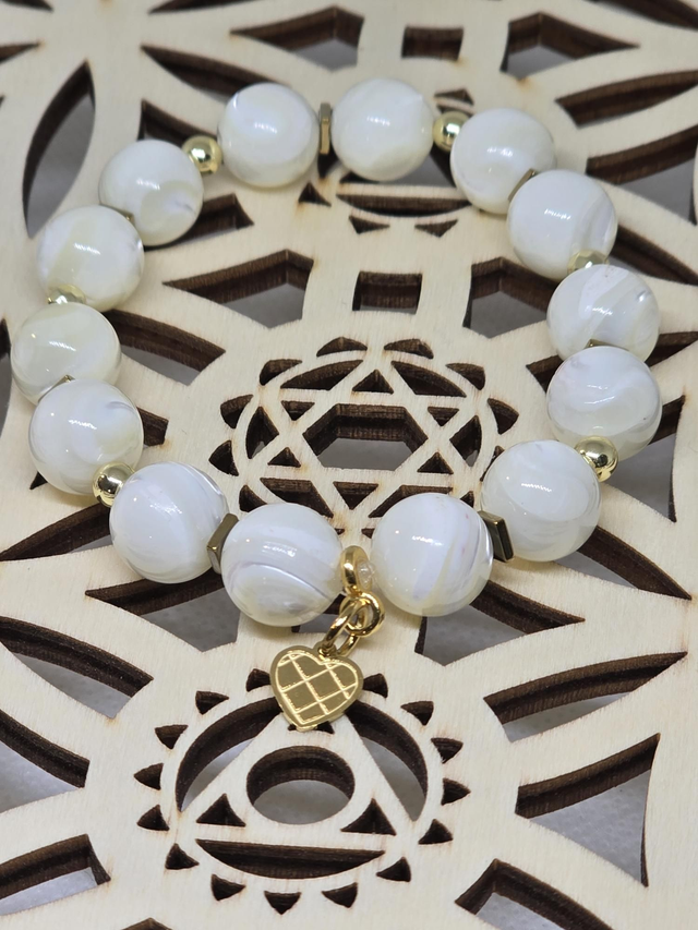 Nacre : chakra coronal (blanc). Douceur, pureté, féminité, bien-être. Polyvalente, elle possède des propriétés apaisantes, équilibrantes et protectrices. Elle rééquilibre la circulation énergétique entre le corps et l'esprit, favorisant ainsi la santé. Elle aide à accéder à la sagesse et à une meilleure maitrise de soi. Évitez le contact avec l'eau.