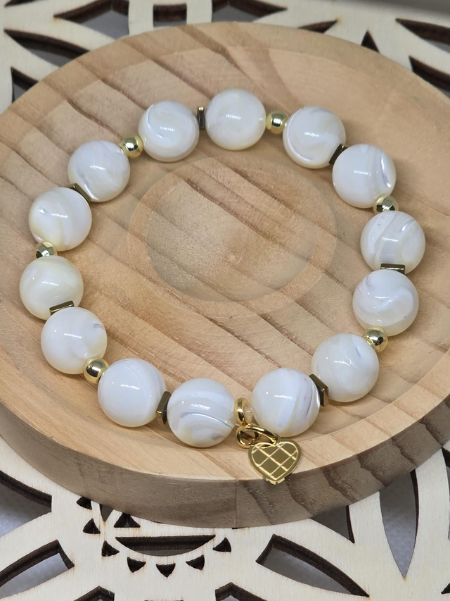 Bracelet fait main sur fil élastique solide composé de Nacre blanc en 1 cm ainsi que de perles en hématite plaquée et acier inoxydable.