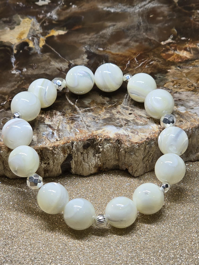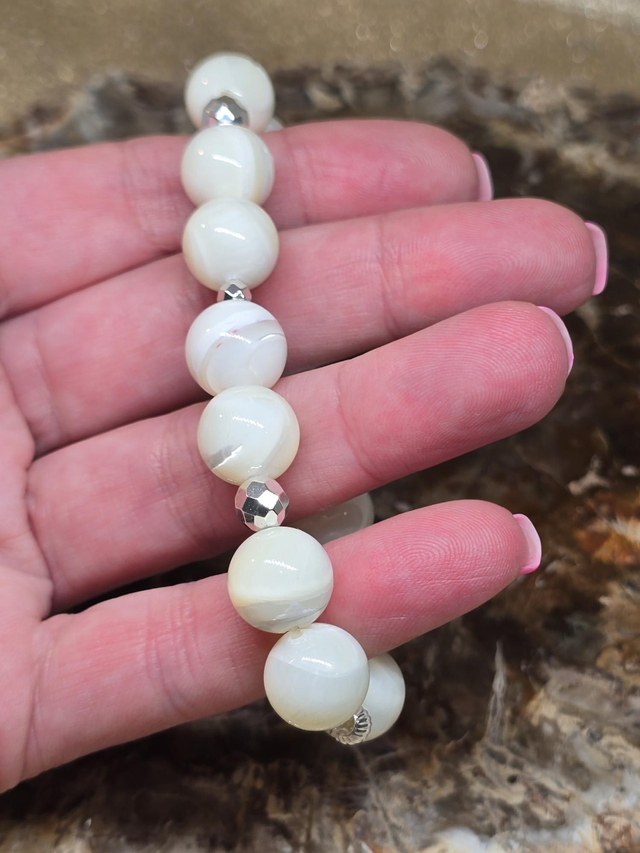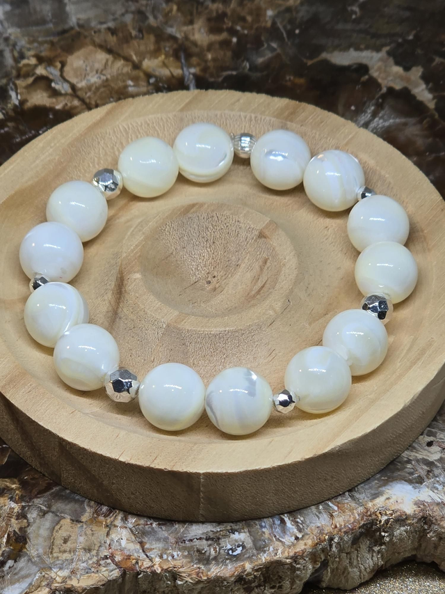 Bracelet fait main sur fil élastique solide composé de Nacre blanc XL en 1,2 cm ainsi que de perles en hématite plaqué.