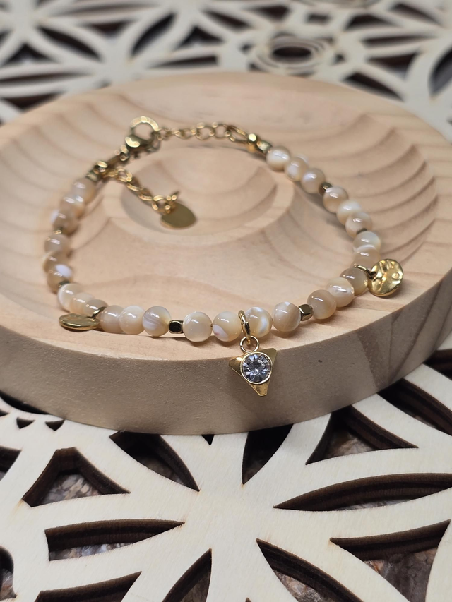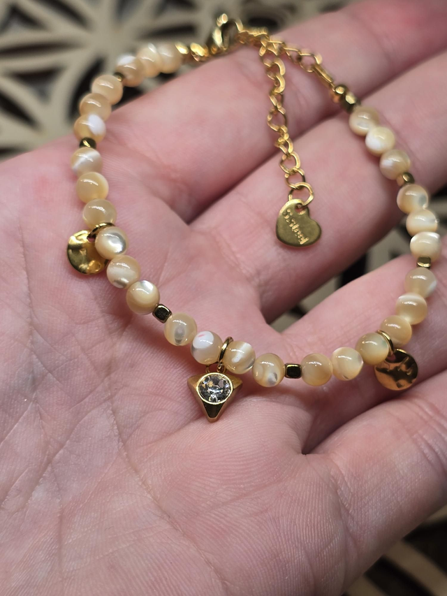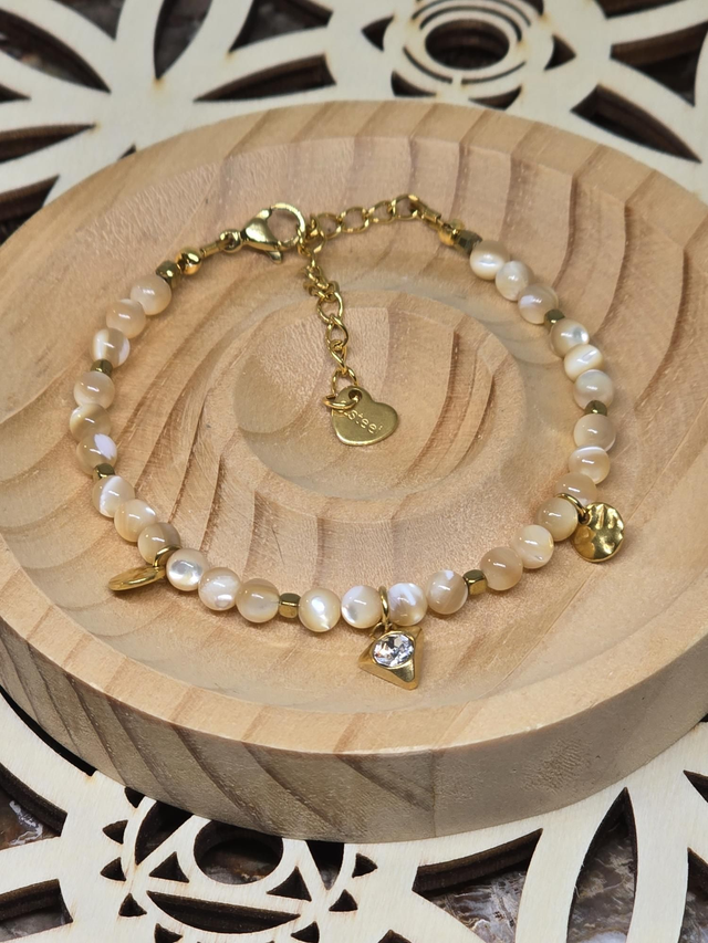 Nacre : chakra sacré (jaune). Douceur, pureté, féminité, bien-être. Polyvalente, elle possède des propriétés apaisantes, équilibrantes et protectrices. Elle rééquilibre la circulation énergétique entre le corps et l'esprit, favorisant ainsi la santé. Elle aide à accéder à la sagesse et à une meilleure maitrise de soi. Évitez le contact avec l'eau.