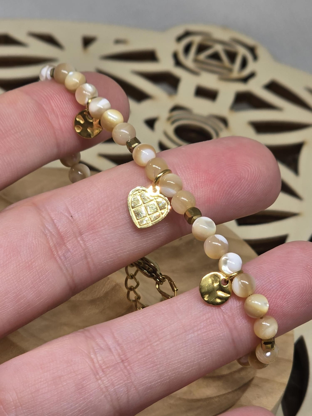 Nacre : chakra sacré (jaune). Douceur, pureté, féminité, bien-être. Polyvalente, elle possède des propriétés apaisantes, équilibrantes et protectrices. Elle rééquilibre la circulation énergétique entre le corps et l'esprit, favorisant ainsi la santé. Elle aide à accéder à la sagesse et à une meilleure maitrise de soi. Évitez le contact avec l'eau.