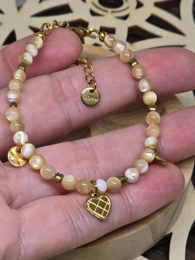 Bracelet fait main sur fil fixe, taille réglable avec chaînette d'extension, composé de Nacre doré en 0,4 cm, ainsi que de perles en hématite plaqué et acier inoxydable.