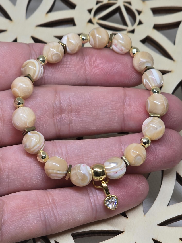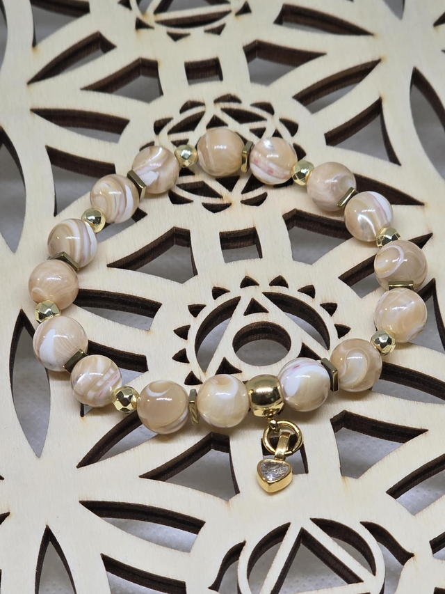 Bracelet fait main sur fil élastique solide composé de Nacre doré en 0,8 cm ainsi que de perles en hématite plaquée et acier inoxydable.
