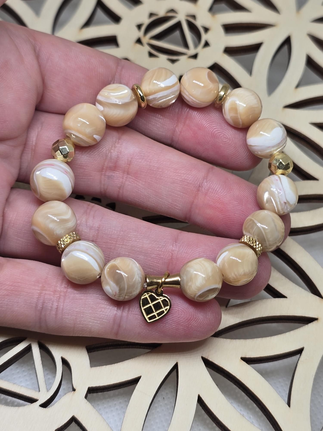 Bracelet fait main sur fil élastique solide composé de Nacre doré en 1 cm ainsi que de perles en hématite plaquée et acier inoxydable.