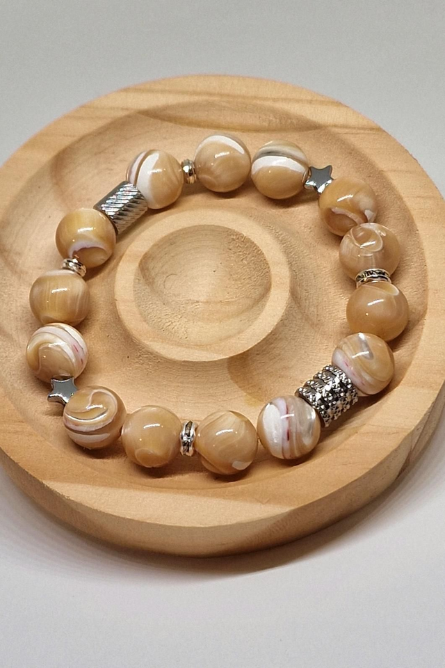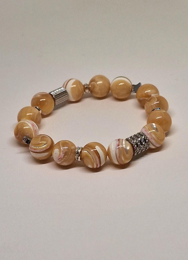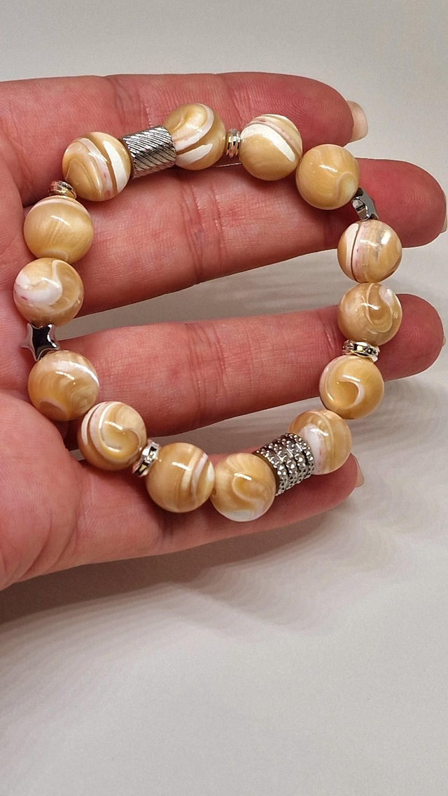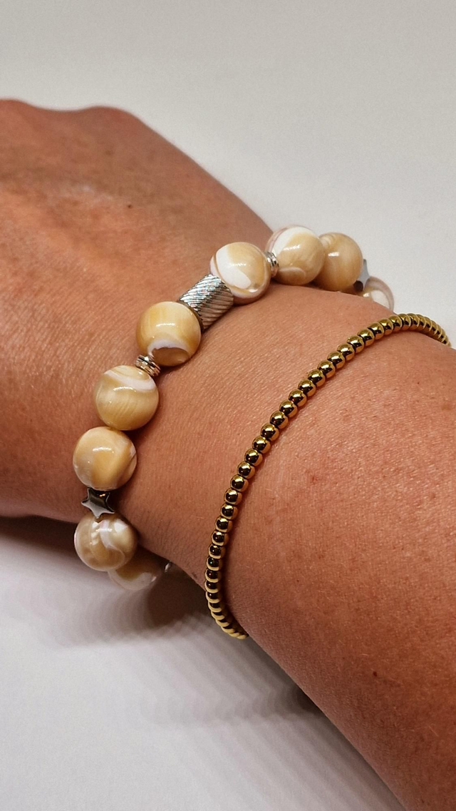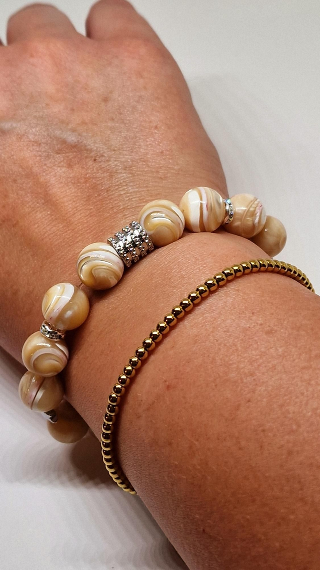 ✨ Bracelet fait main sur fil élastique solide, composé de Nacre doré en 1 cm ainsi que de perles plaquées argent et acier inoxydable.