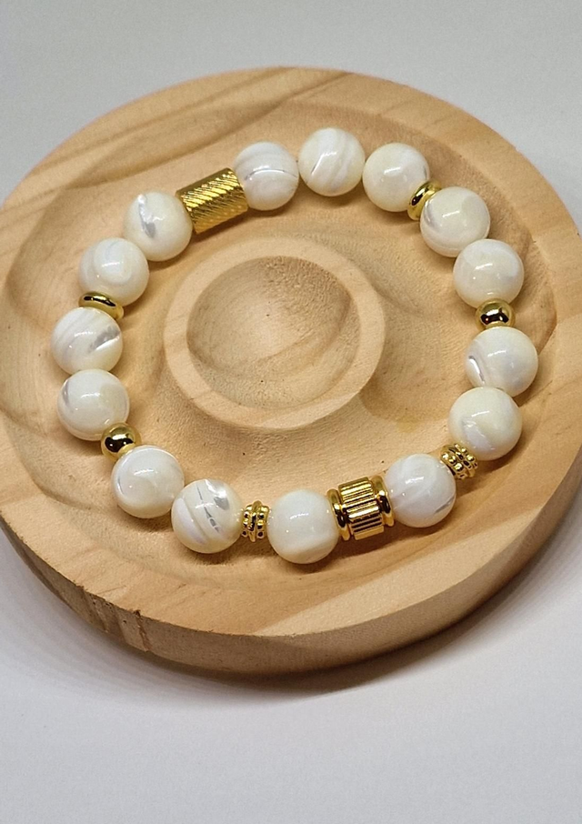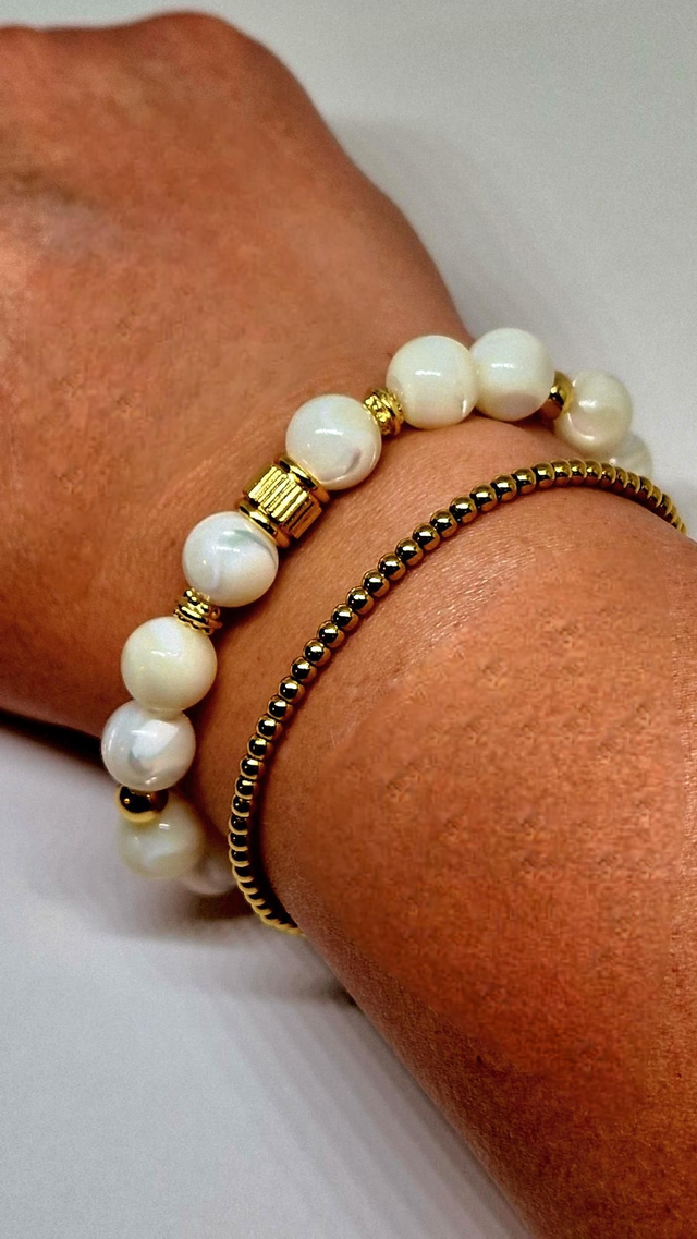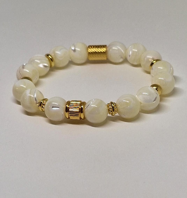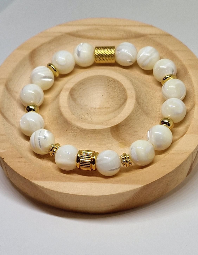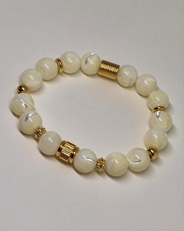 Bracelet fait main sur fil élastique solide, composé de Nacre en 1 cm ainsi que de perles dorées à l'or fin et acier inoxydable doré.