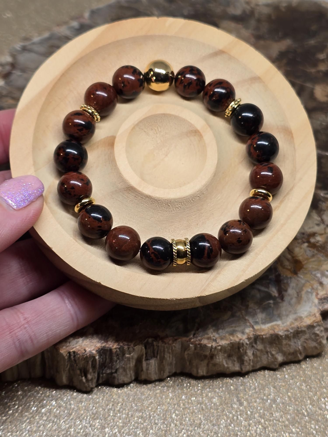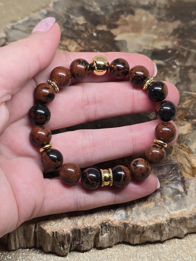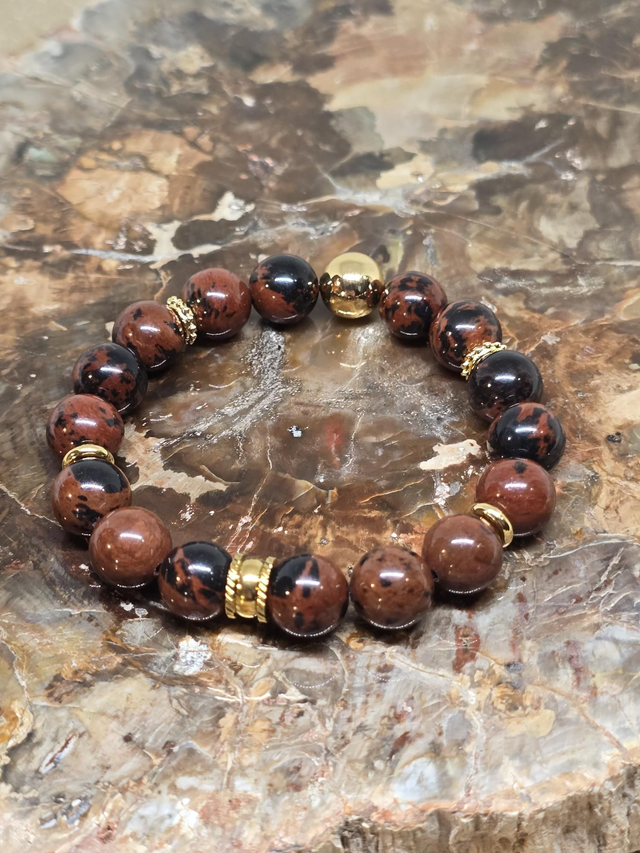 ✨ Bracelet fait main sur fil élastique solide composé d'Obsidienne acajou en 1cm ainsi que de perles plaquées et acier inoxydable doré