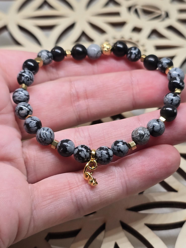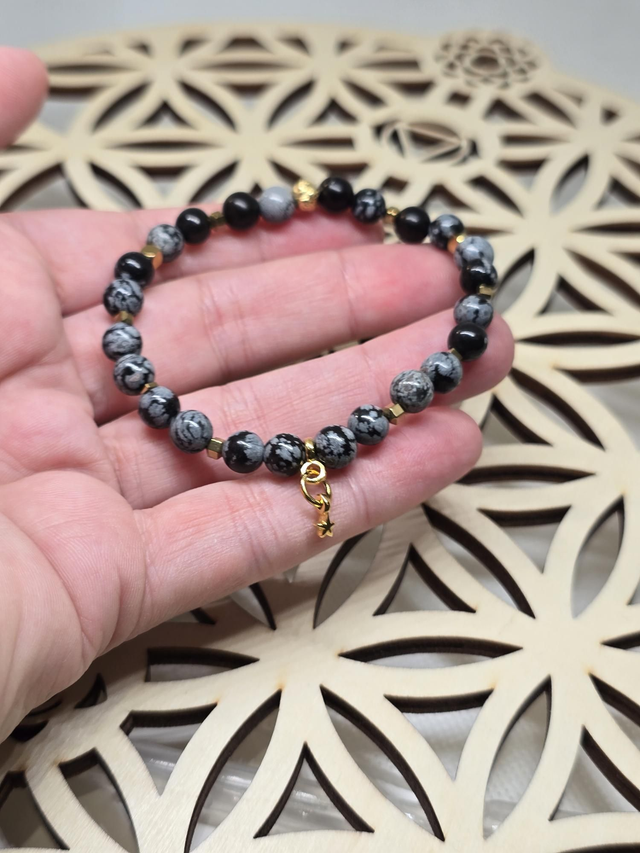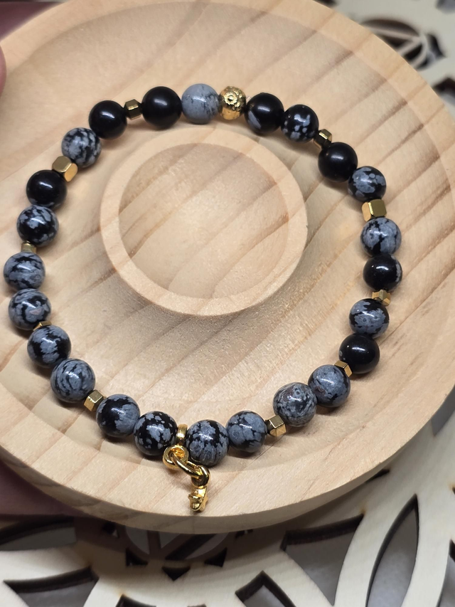 Bracelet fait main sur fil élastique solide composé d'Obsidienne flocon en 0,6 cm ainsi que de perles en hématite plaquée et acier inoxydable.