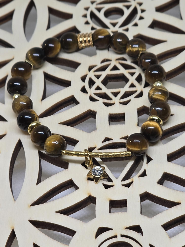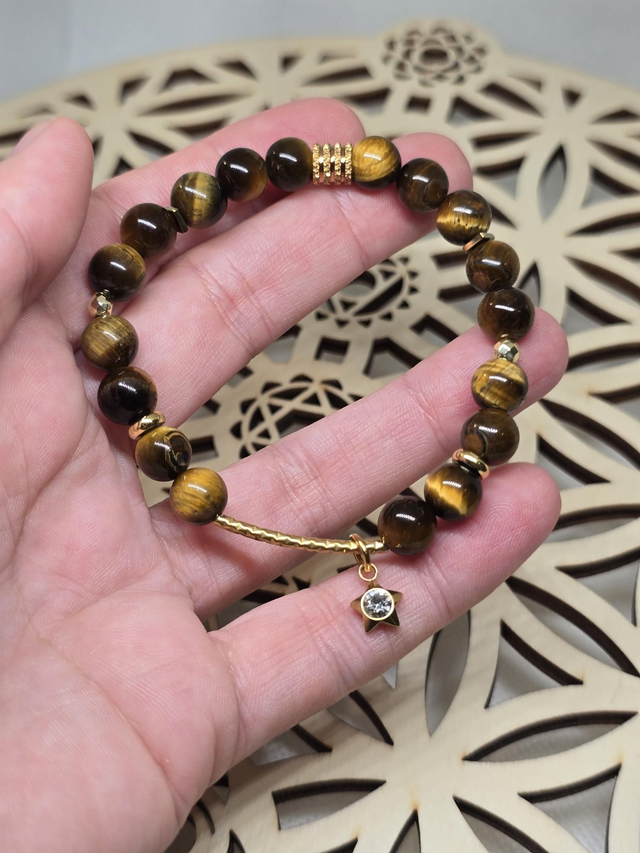 Œil de tigre : Chakra du plexus solaire (jaune). Pierre de protection et de l’égo, elle donne force, courage, dynamisme et vitalité, persévérance, réussite. Aide à croire en l'avenir et surtout à fixer des objectifs atteignables et réalistes. Combat la fatigue chronique. Évitez en cas période agressive.
