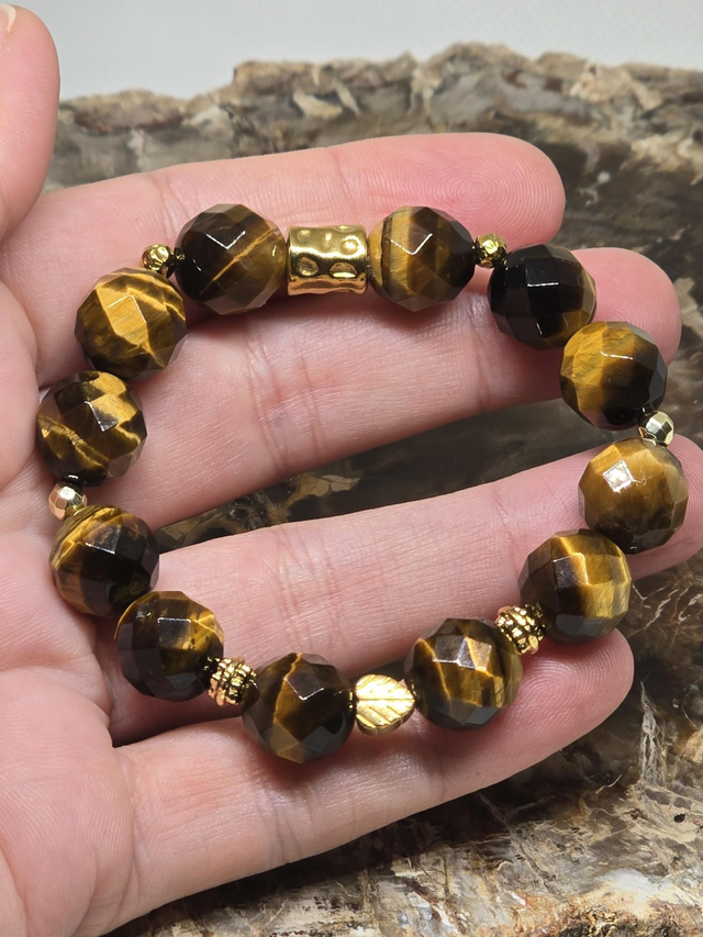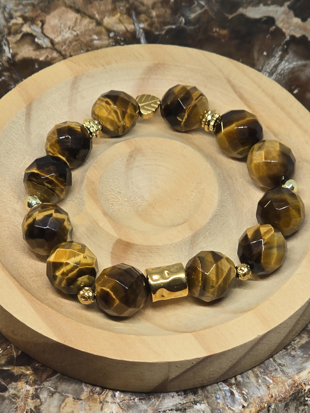 Bracelet fait main sur fil élastique solide composé d'œil de Tigre XL à facettes ainsi que de perles en hématite plaquée et acier inoxydable.