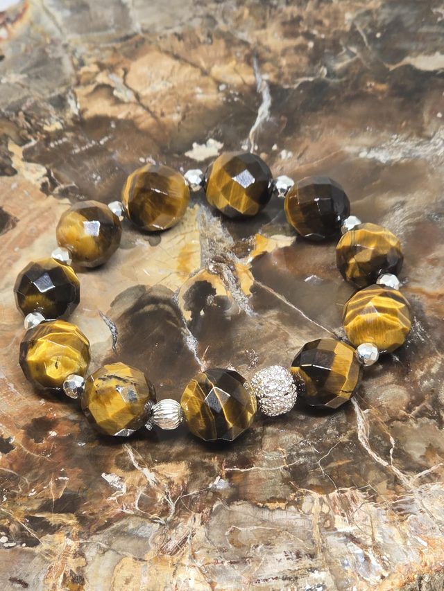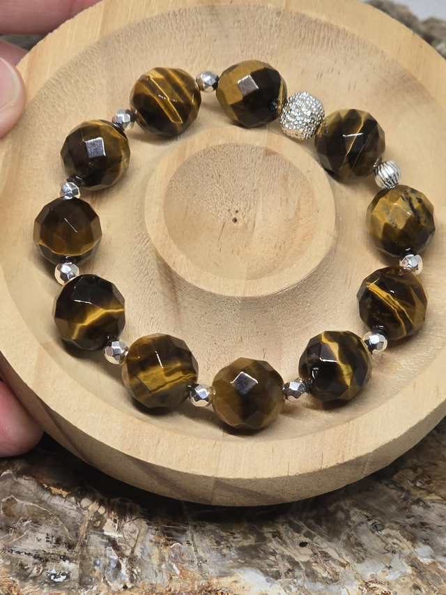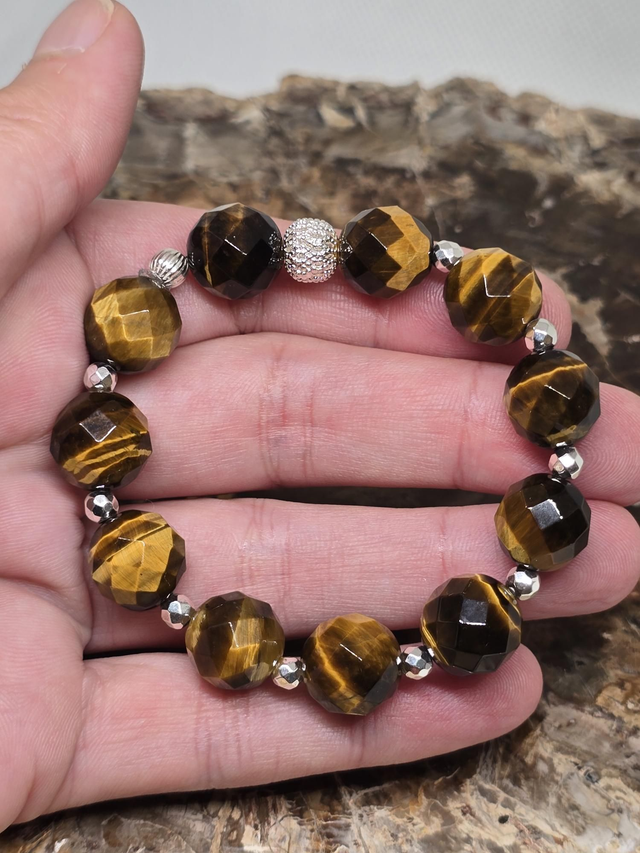 Bracelet fait main sur fil élastique solide composé d'Oeil de tigre à facettes XL en 1,2 cm ainsi que de perles en hématite plaquée et argent 925.