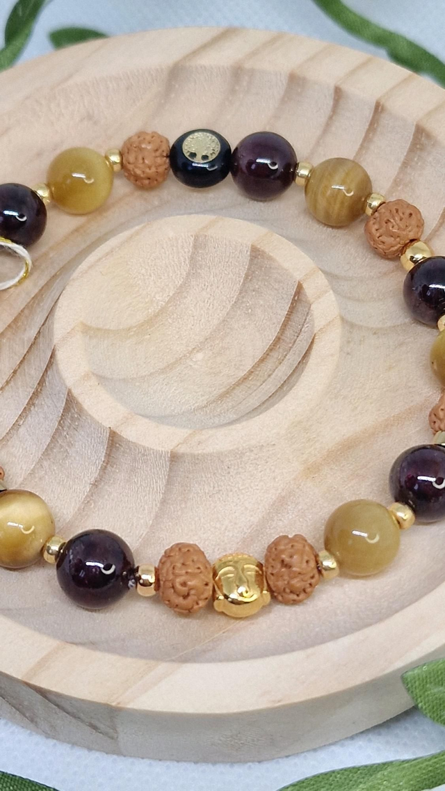 ✨ Bracelet fait main sur fil élastique solide, composé de pierre véritable: Grenat, Œil de tigre doré et Grenat en 0,8 cm ainsi que de perles dorées à l'or fin.