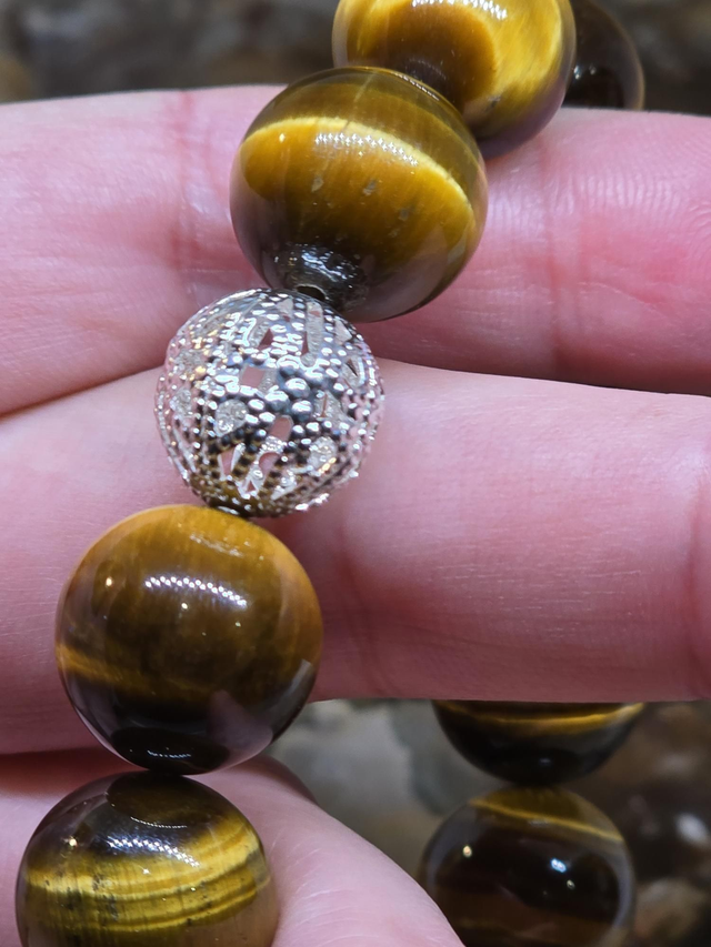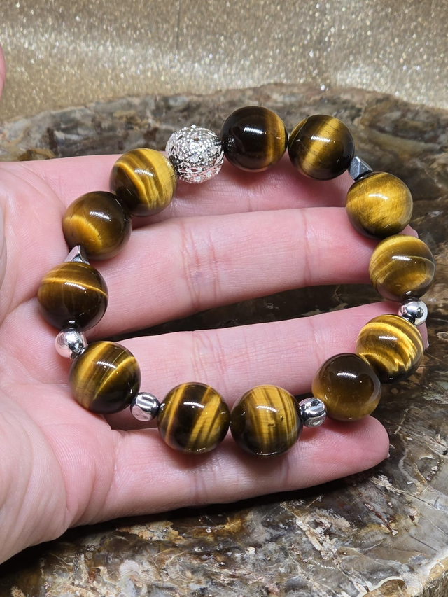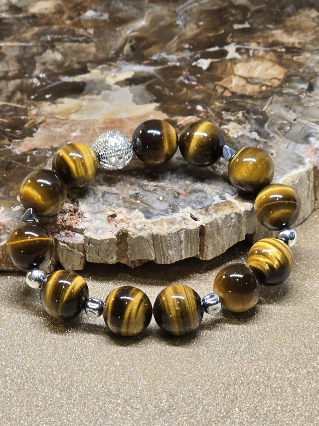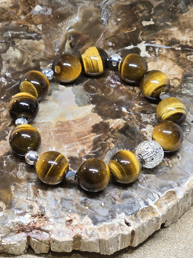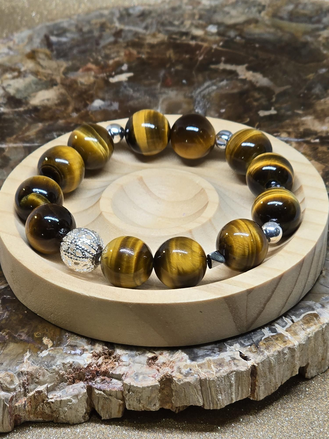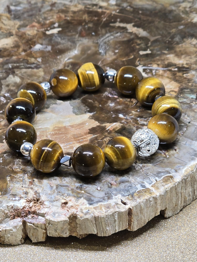 Bracelet fait main sur fil élastique solide composé d'Oeil de tigre XXL en 1,4 cm ainsi que de perles en plaqué argent.