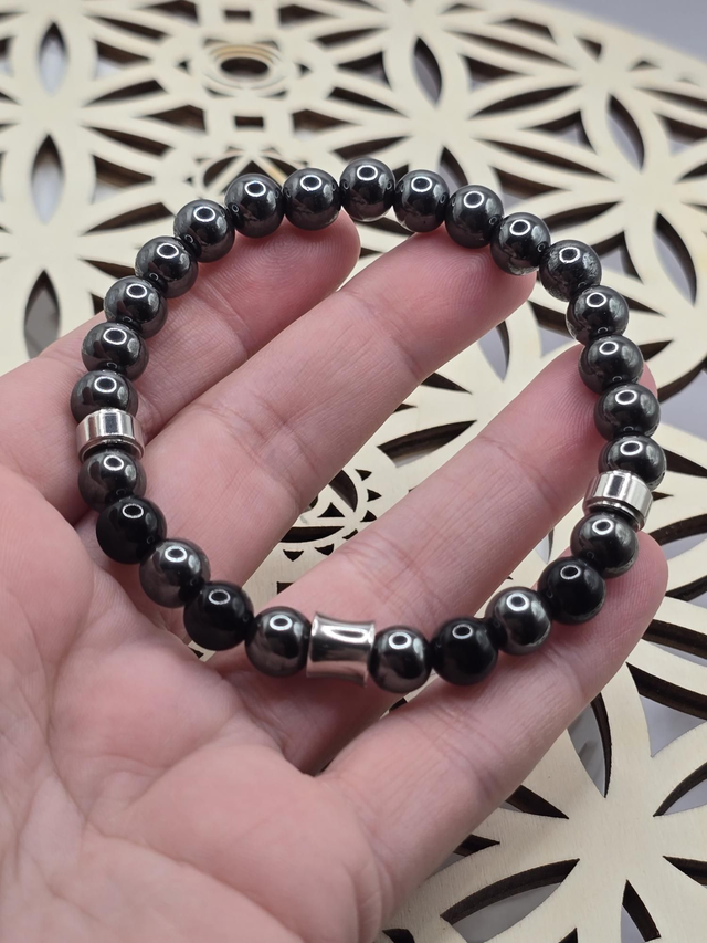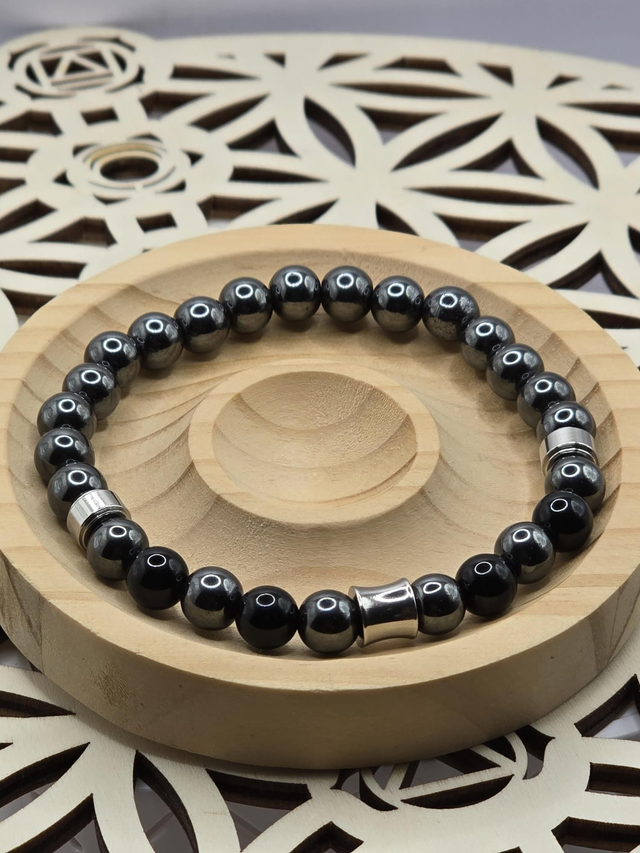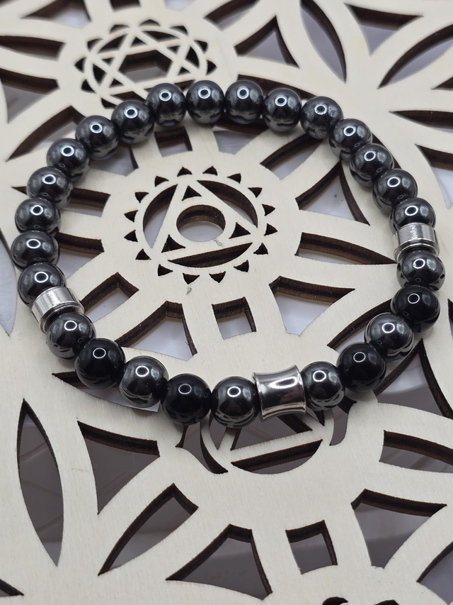 Hématite : Chakra racine, ancrage, apaisement, courage, vitalité, dynamisme, magnétisme, cauchemar, clarté émotionnelle, aide à aller de l'avant, idéal pour les hypertendus & problème d'autorité.