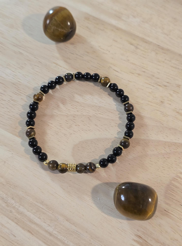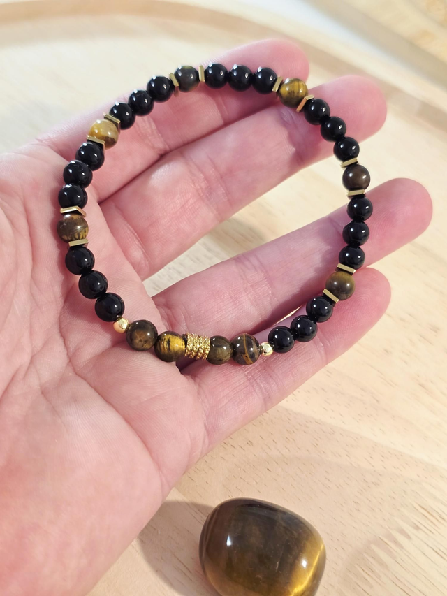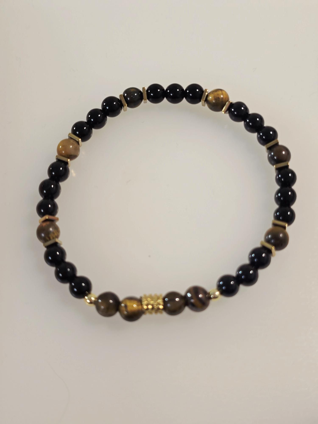 Bracelet fait main sur fil élastique solide composé d'Oeil de tigre et Onyx en 0,6 cm ainsi que de perles en hématite plaquée et acier inoxydable.