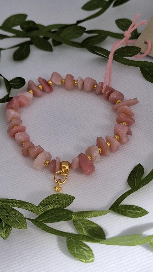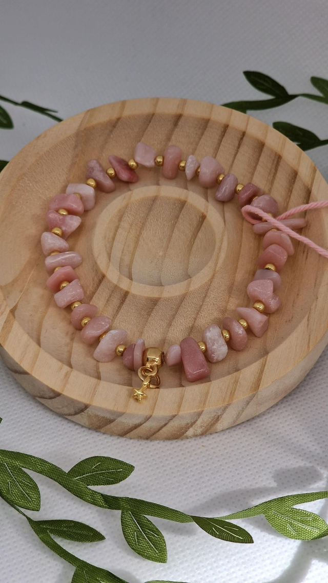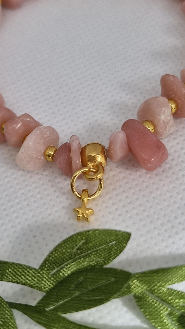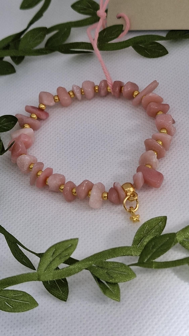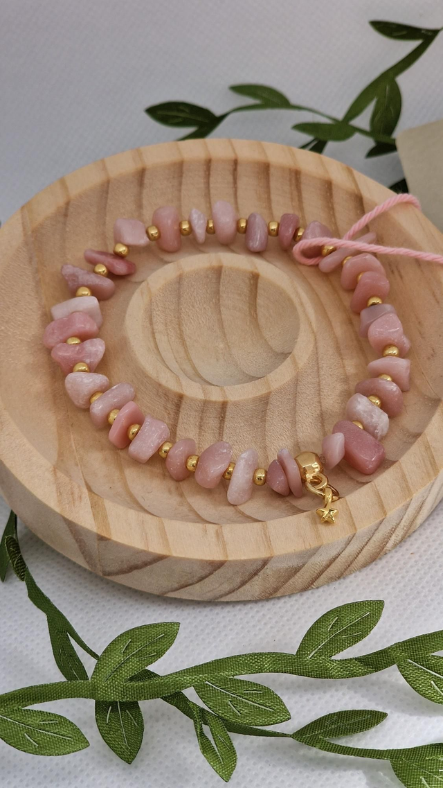 🌟 Bracelet baroque fait main sur fil élastique solide et composé d'Opale rose forme chips ainsi que de perles dorées à l'or fin.