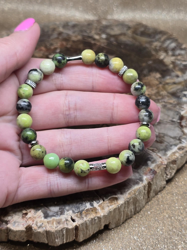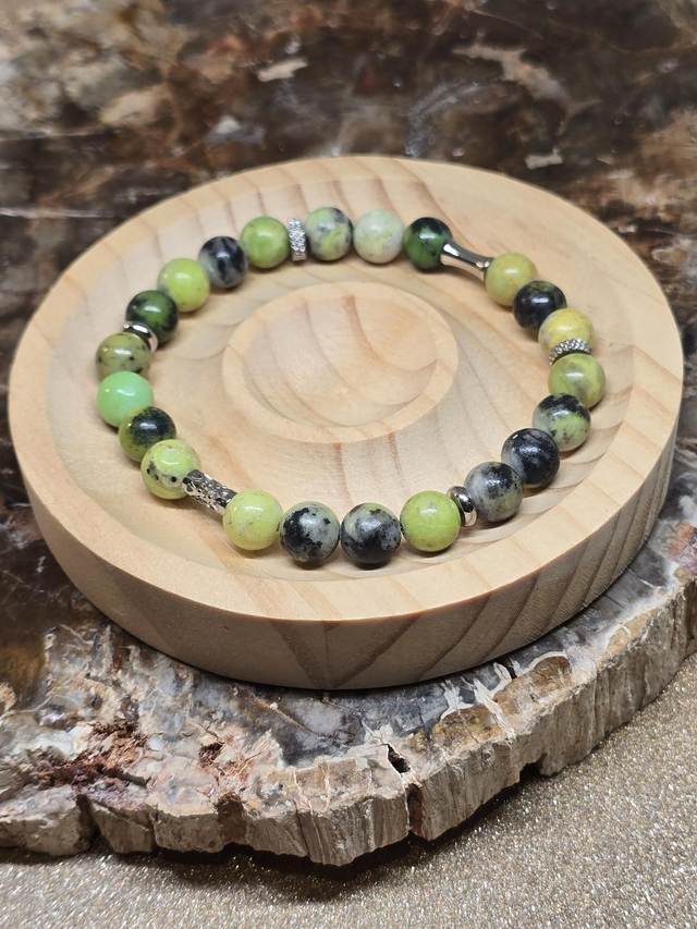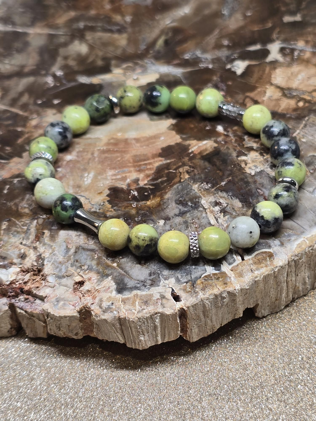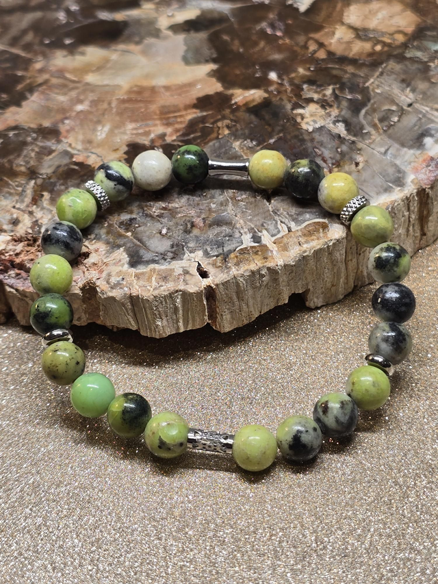 ✨ Bracelet fait main sur fil élastique solide composé d'Opale verte fossilisée en 0,8 cm ainsi que de perles en acier inoxydable