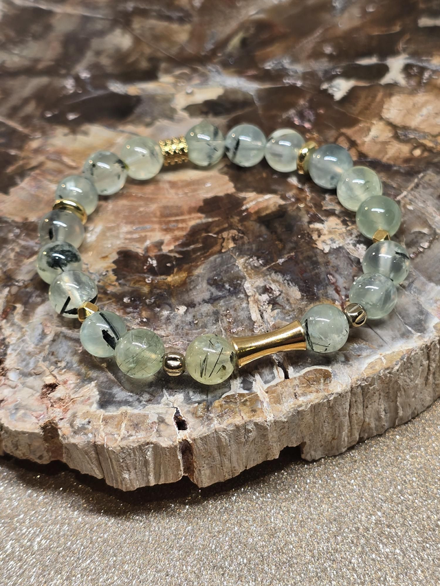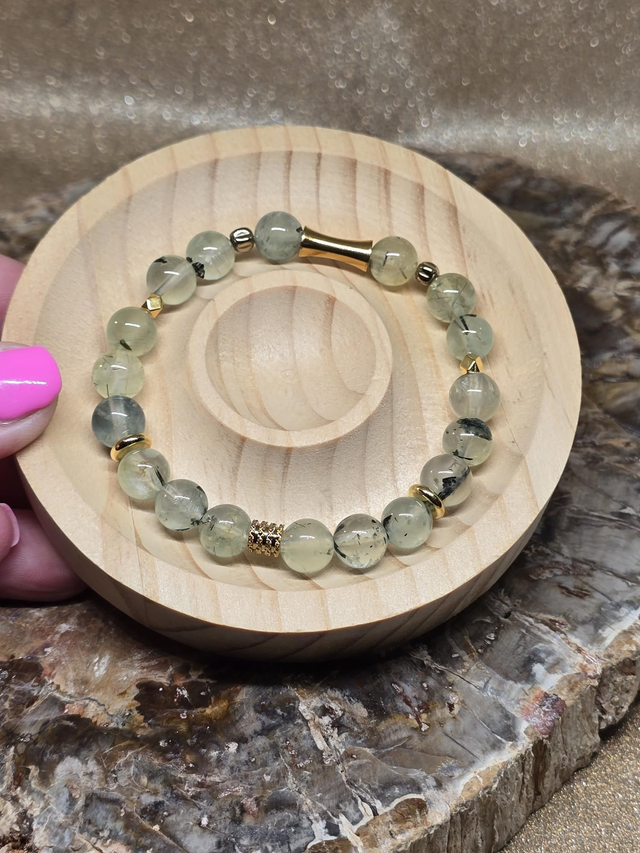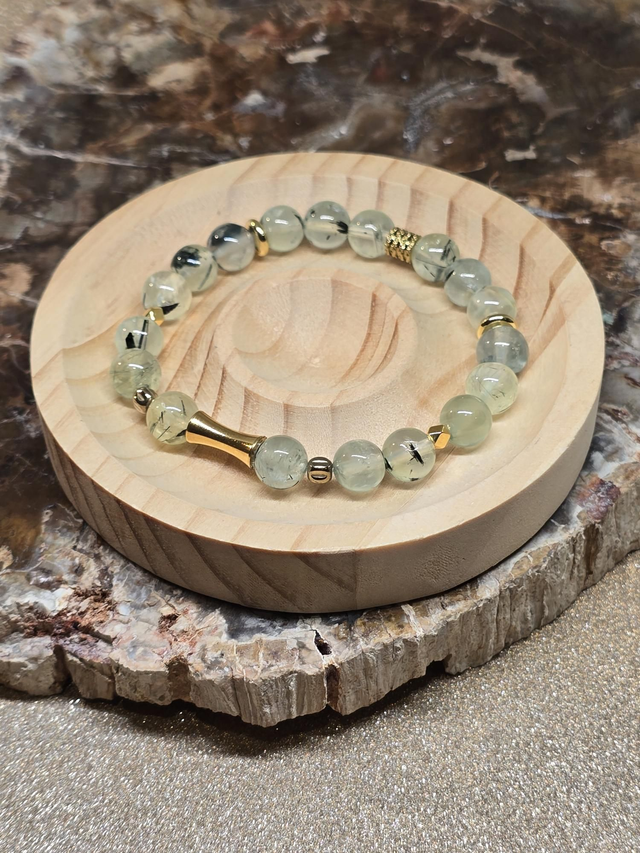 ✨ Bracelet fait main sur fil élastique solide composé de Phrénite en 0,8 cm ainsi que de perles plaquées et acier inoxydable doré.