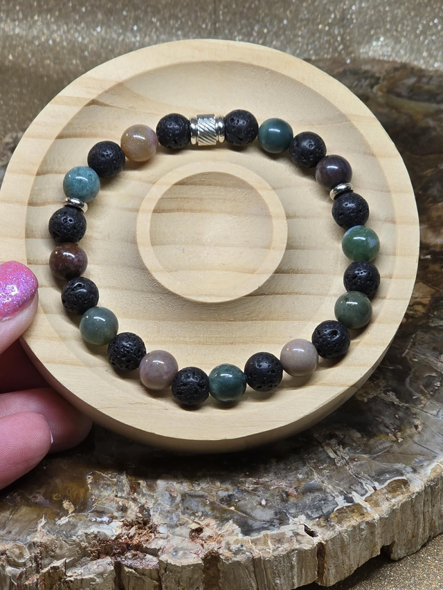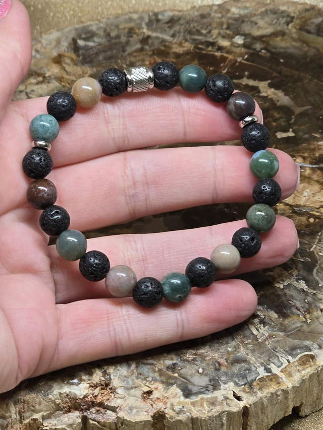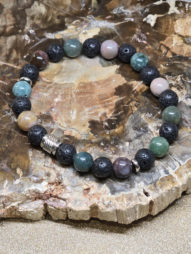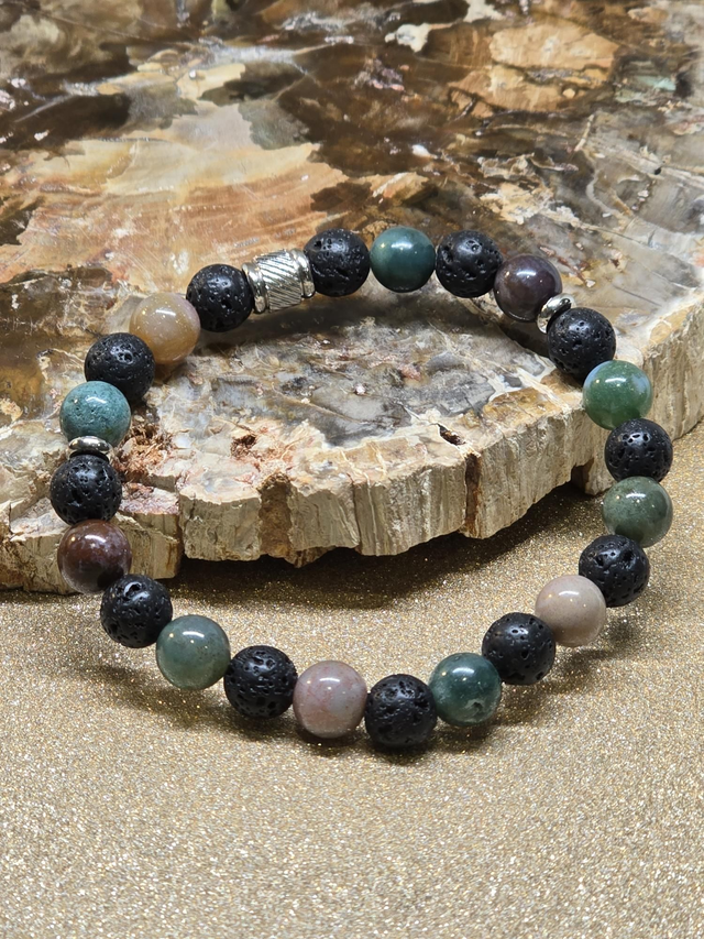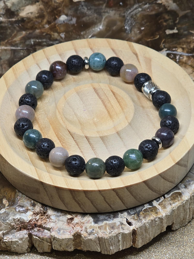 Bracelet Homme fait main sur fil élastique solide composé de Pierre de lave et Agate indienne en 0,8 cm ainsi que de perles en acier inoxydable.