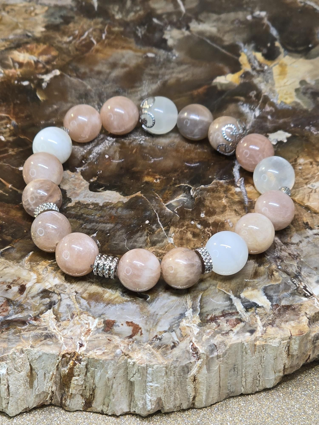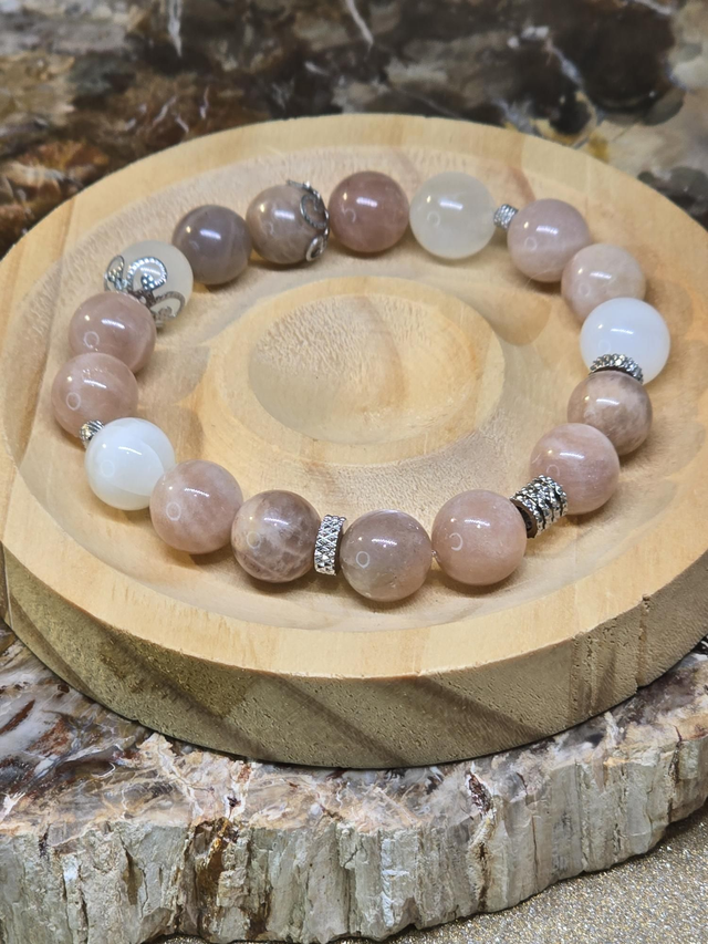 Bracelet fait main sur fil élastique solide composé de Pierre de lune multicolore en 1 cm ainsi que de perles en acier inoxydable.