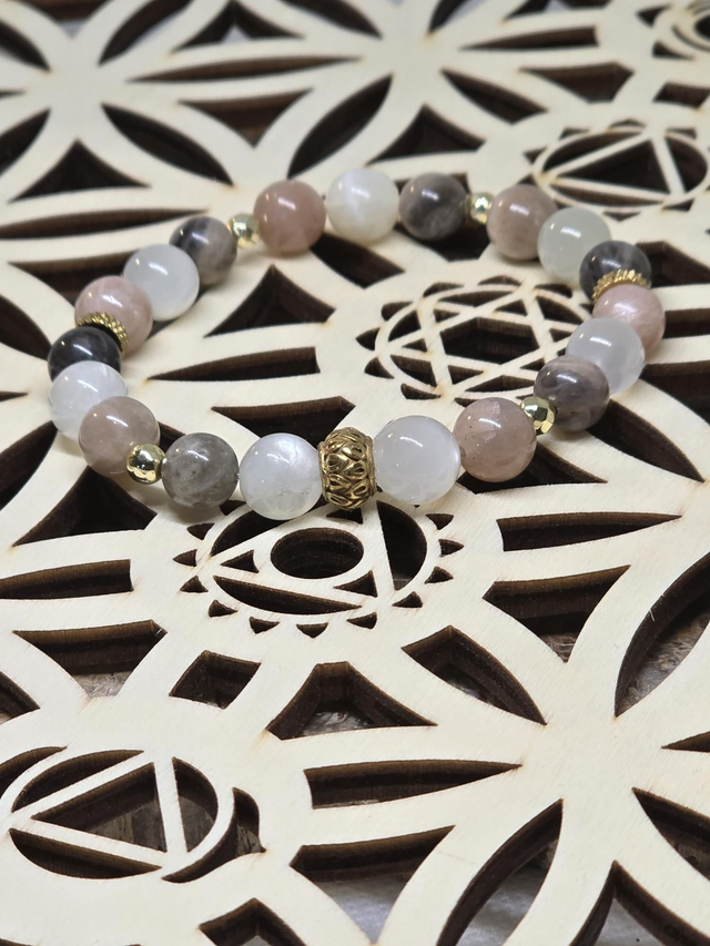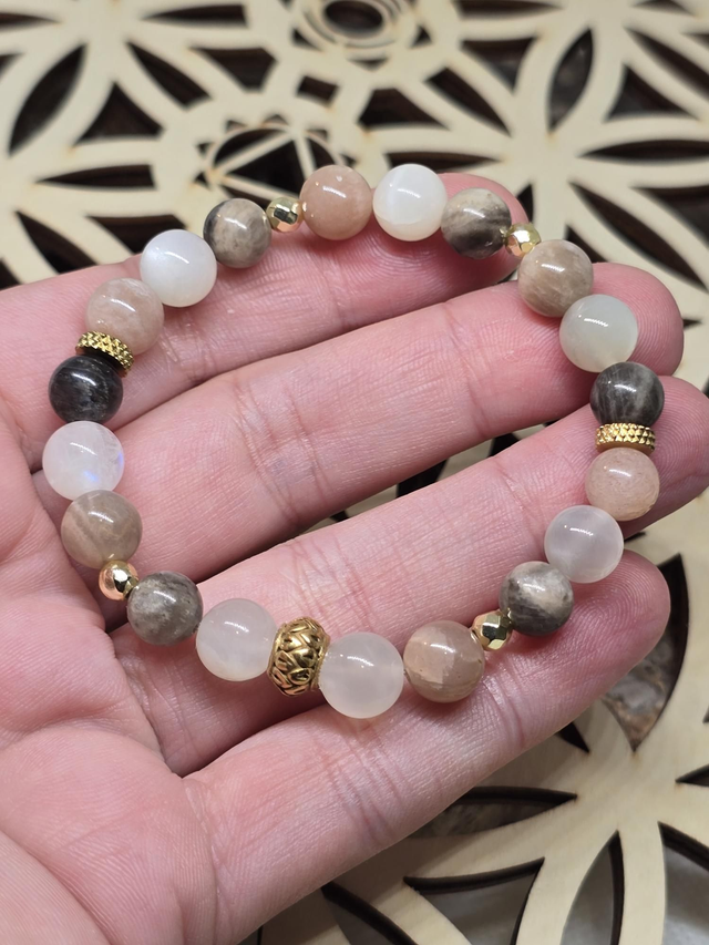 Bracelet fait main sur fil élastique solide composé de Pierre de lune multicolore en 0,8 cm ainsi que de perles en hématite plaquée et acier inoxydable.