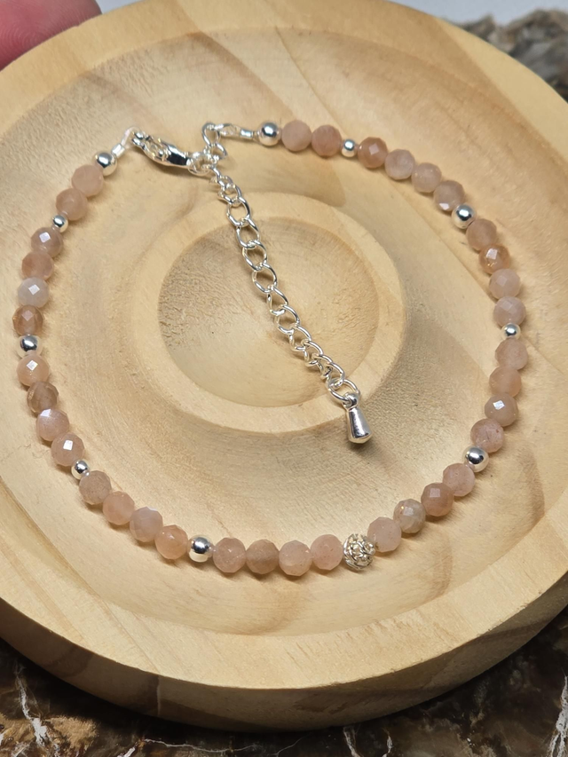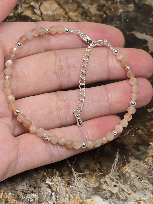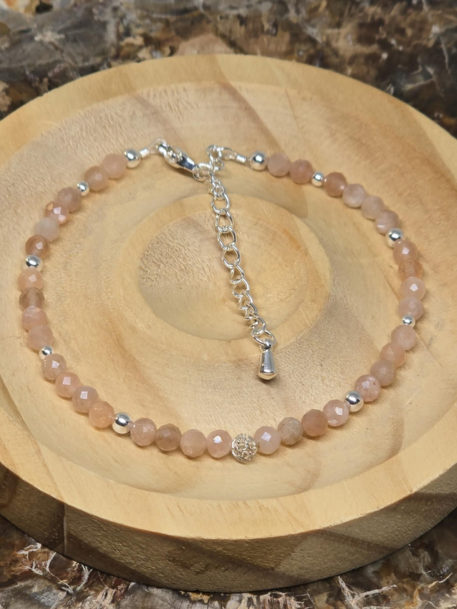 Bracelet sur fil fixe avec chaîne d'extension de 5 cm, composé de Pierre de lune orangée à facettes en 0,4 cm ainsi que de perles en hématite plaquées, argent plaqué et acier inoxydable.