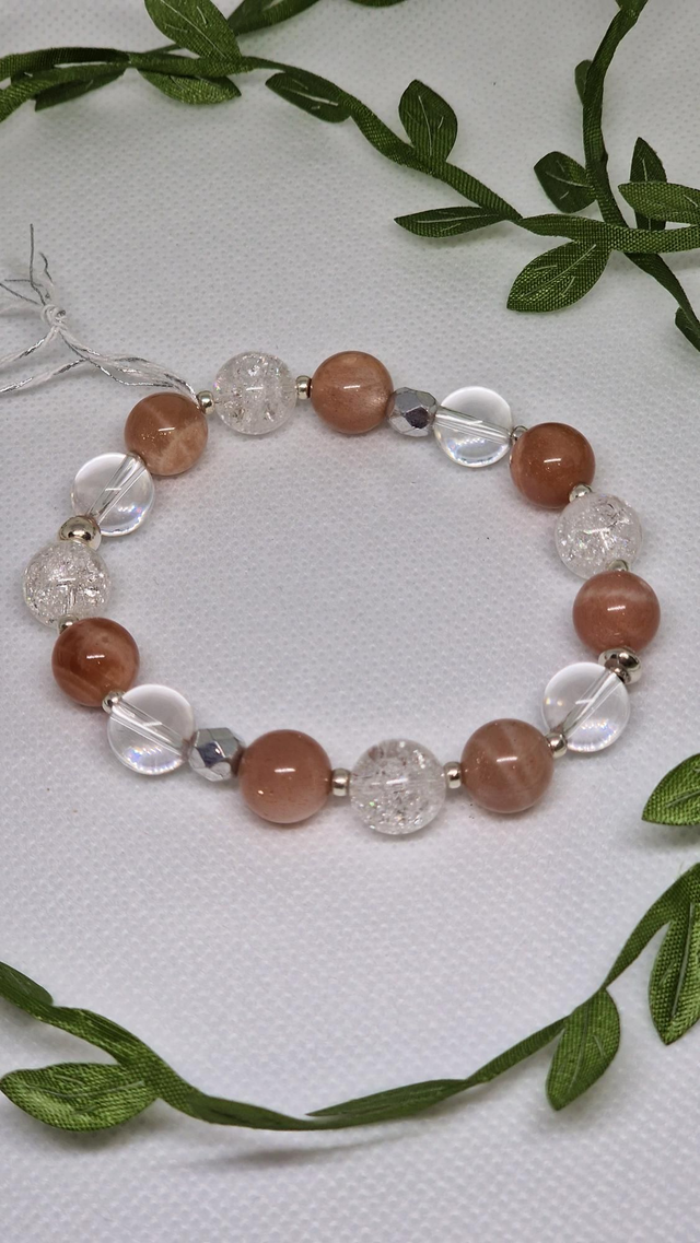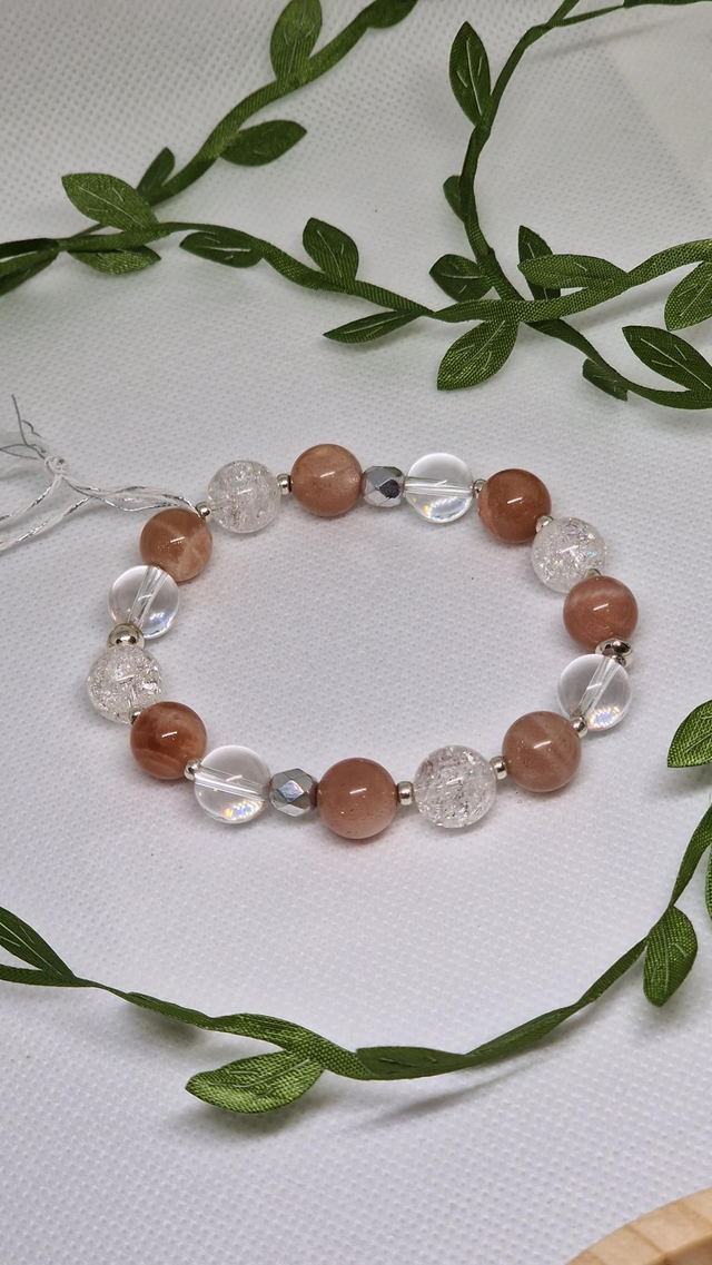 🌟 Bracelet fait main sur fil élastique solide et composé de Pierre de soleil et Cristal de roche craquelé et transparent de 1cm ainsi que de perles en placage argent.