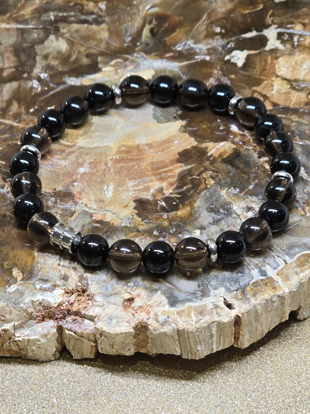 Bracelet Homme fait main sur fil élastique solide composé d'Onyx et Quartz fumé en 0,8 cm ainsi que de perles en acier inoxydable.