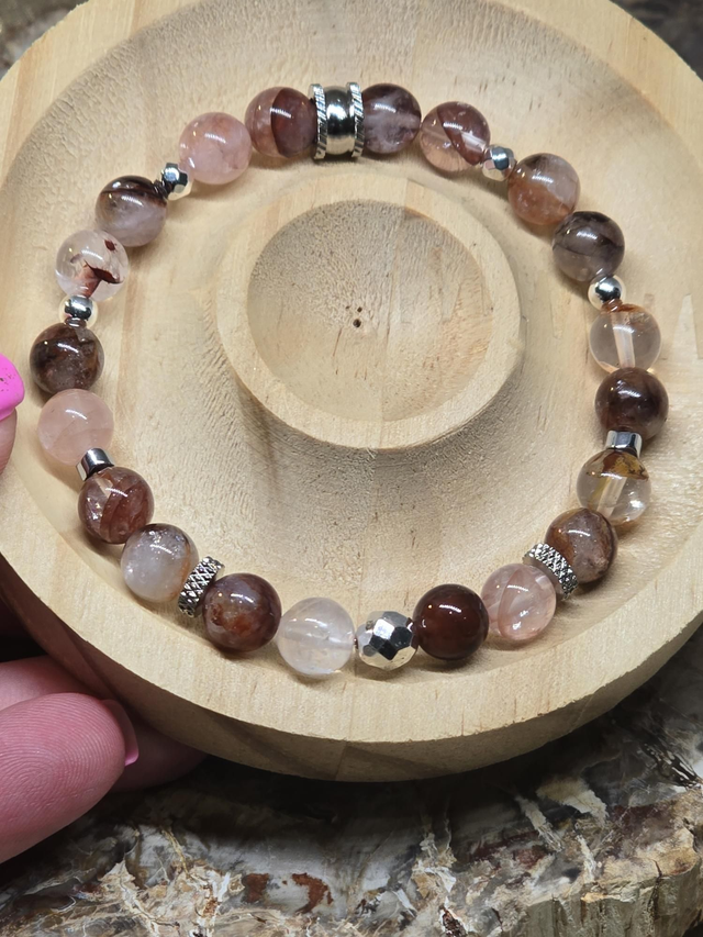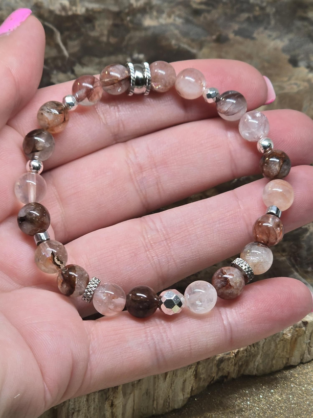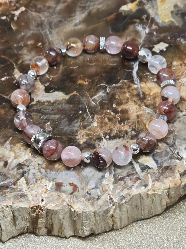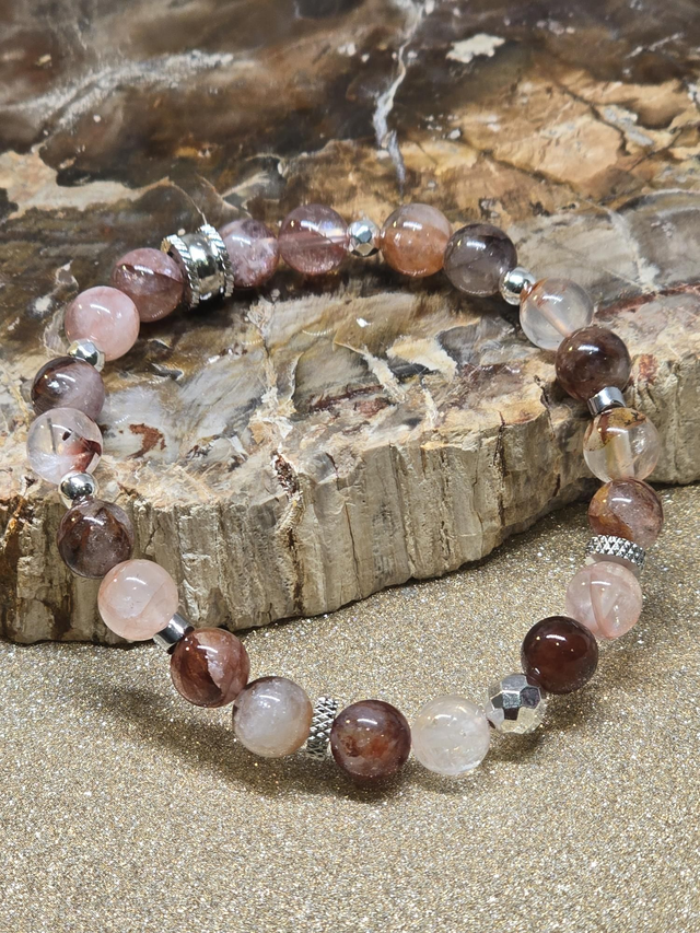 Bracelet fait main sur fil élastique solide composé de Quartz Hématoïde rouge en 0,8 cm ainsi que de perles en hématite plaquée et acier.