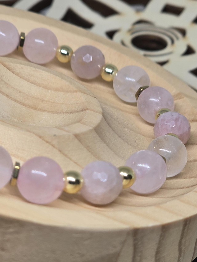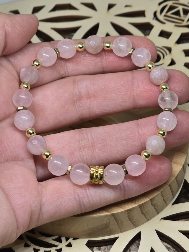 Bracelet fait main sur fil élastique solide composé de Quartz rose en 0,8 cm ainsi que de perles en hématite plaquée et acier inoxydable.