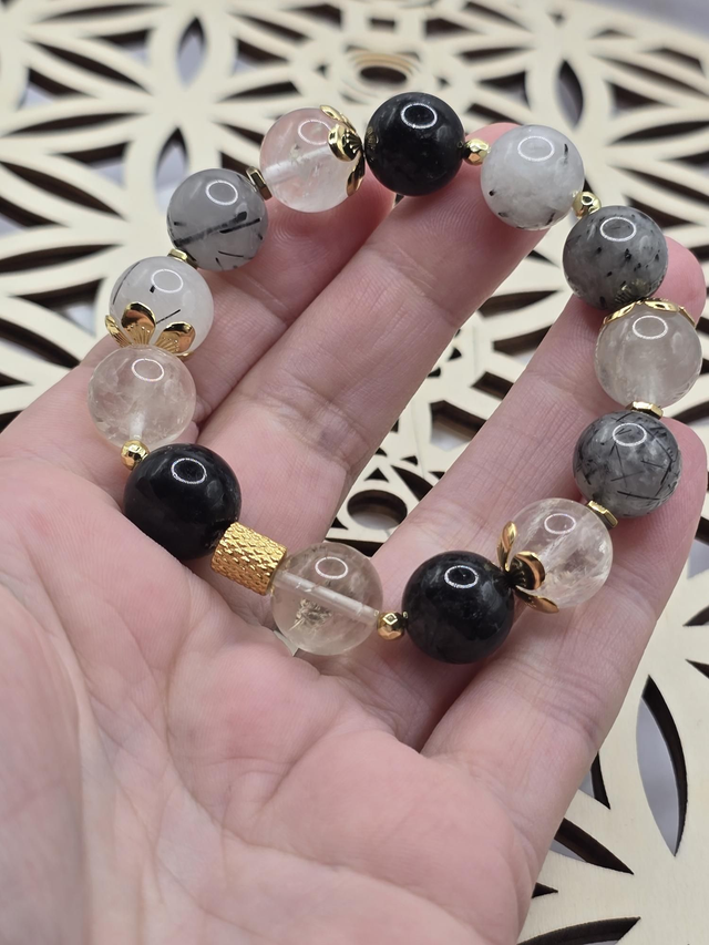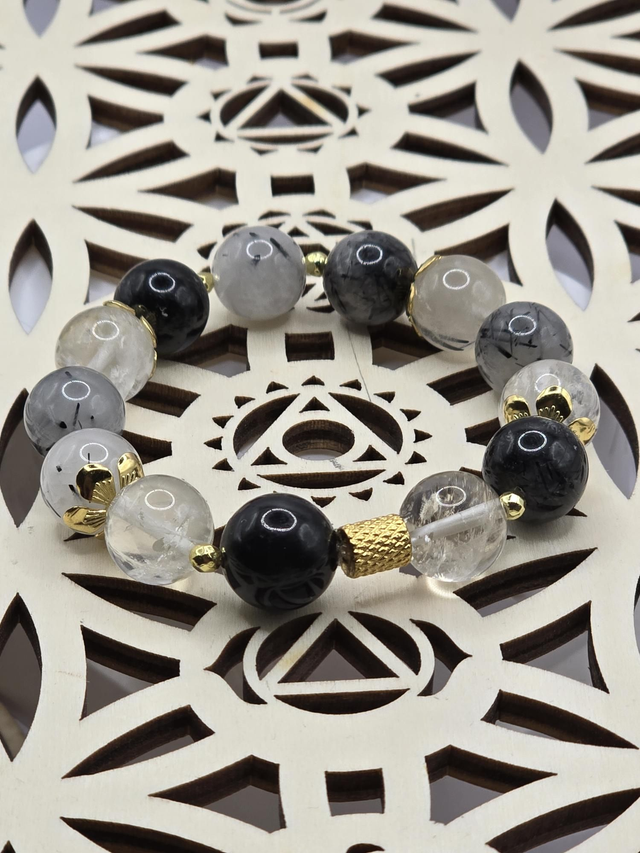 Bracelet fait main sur fil élastique solide composé de Quartz Tourmaline XL en 1,2 cm ainsi que de perles en hématite plaquée et acier inoxydable.