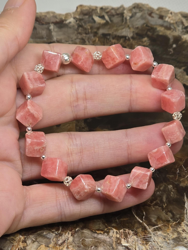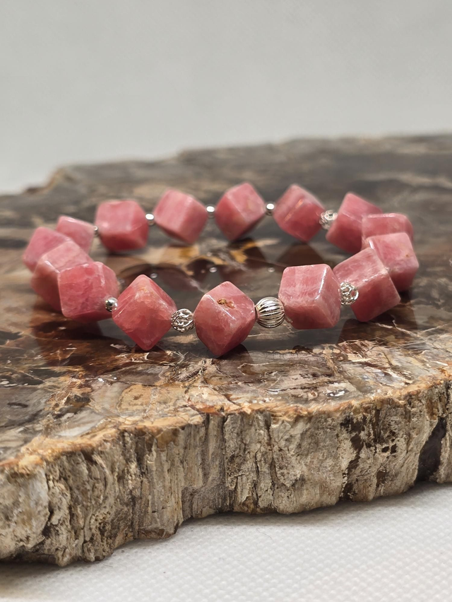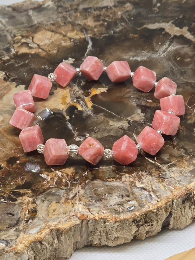 Bracelet fait main sur fil élastique solide composé de Rhodochrosite carrée en 1 cm et perles en hématite plaquée et argent 925