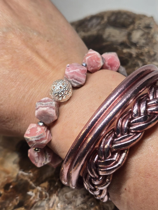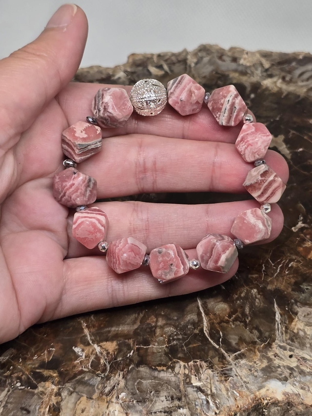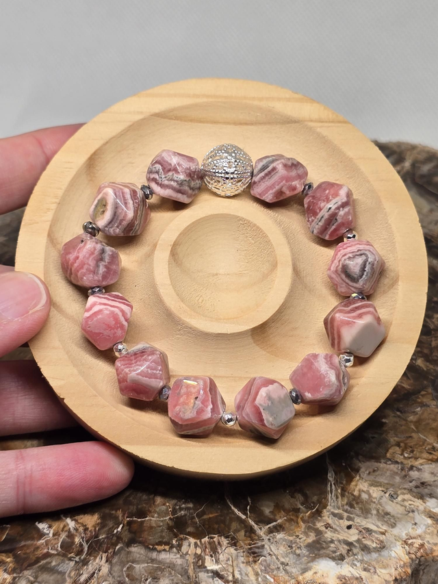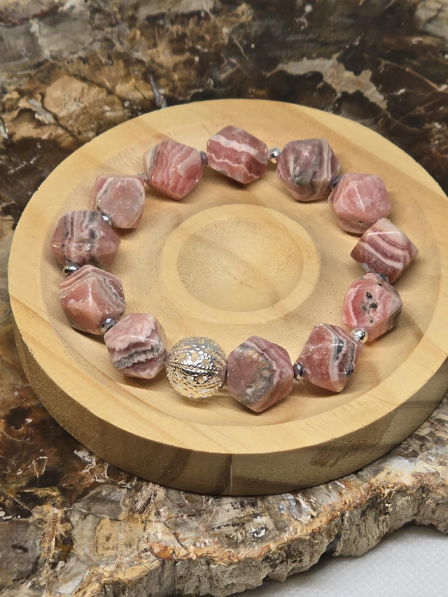 Bracelet fait main sur fil élastique solide composé de Rhodochrosite multifaces XL ainsi que de perles plaquées argent.