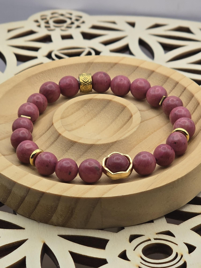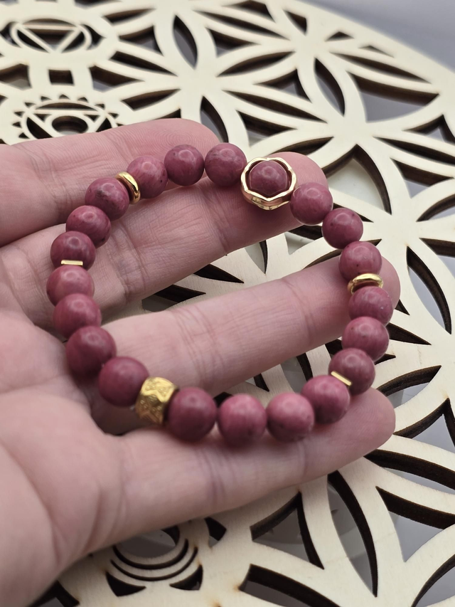 Bracelet fait main sur fil élastique solide composé de Rhodonite rose en 0,8 cm ainsi que de perles en hématite plaquée et acier inoxydable.