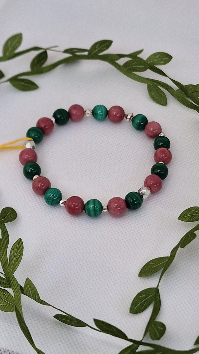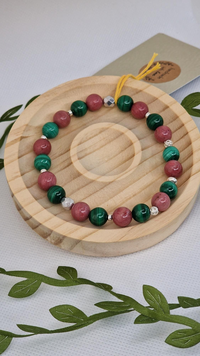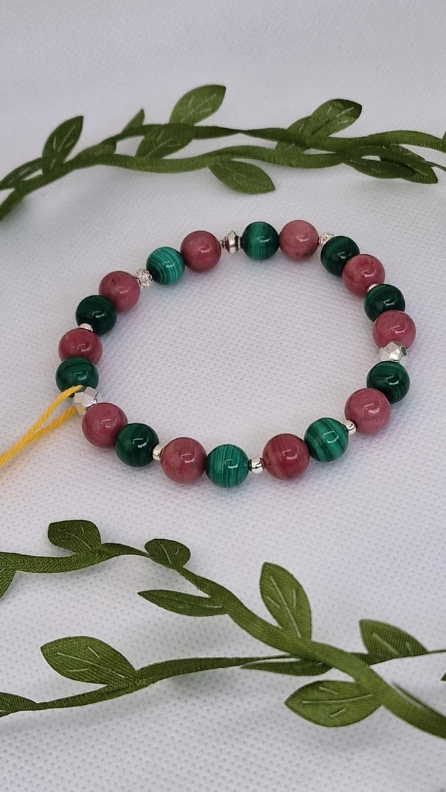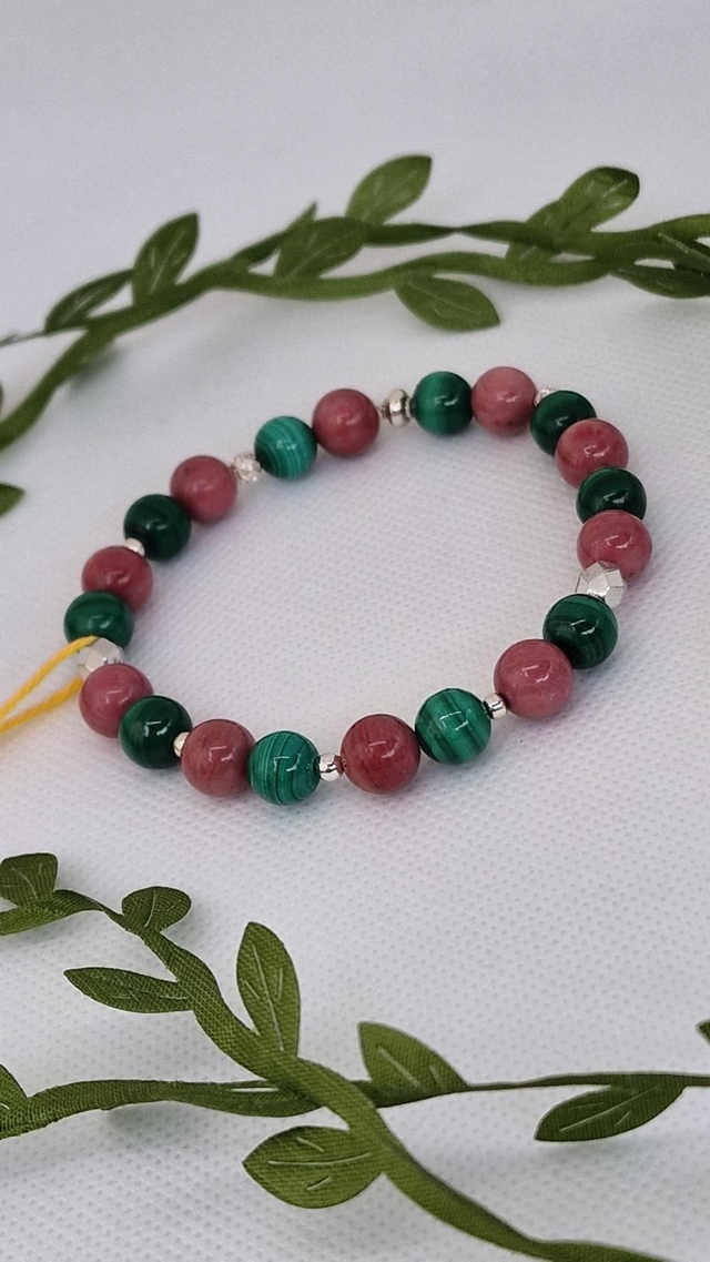 Bracelet fait main sur fil élastique solide et composé de Malachite et Rhodonite 0,8 cm ainsi que de perles en acier inoxydable.