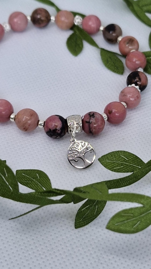 🌟 Bracelet fait main sur fil élastique solide et composé de Rhodonite rose et noir en 0,8 cm ainsi que de perles en argent et placage argent.