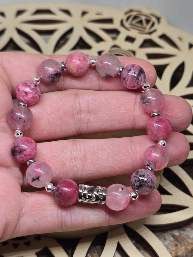 Rhodonite : Chakra du cœur (rose) : travaille sur les blessures émotionnelles, affectives et chocs émotionnels : deuil, rupture, anciennes blessures émotionnelles non guérit. Aide à vivre dans le moment présent pour vivre des relations plus saines. Elle aide à combattre l'autodestruction émotionnelle en facilitant le pardon. Elle offre une réelle introspection émotionnelle.