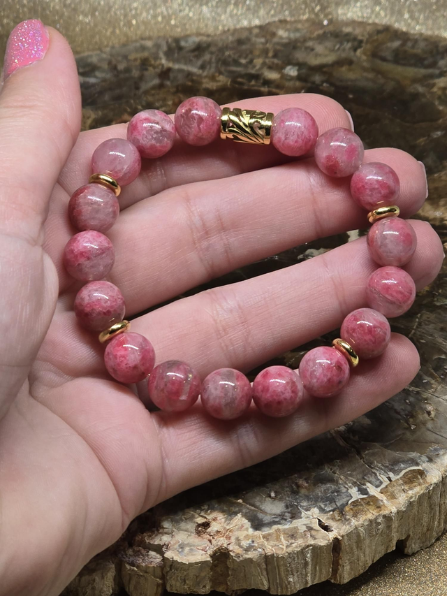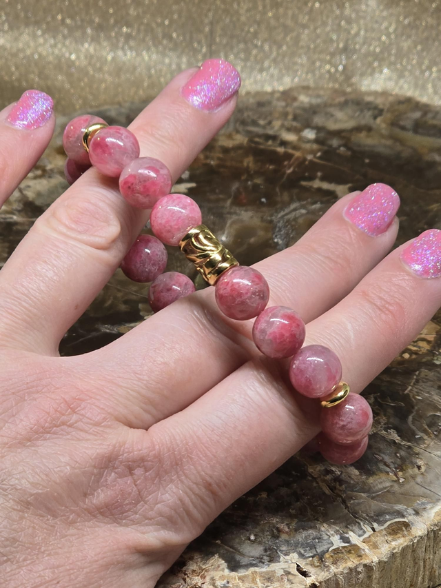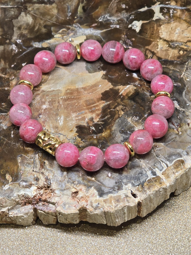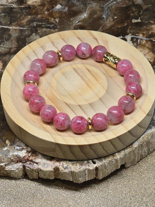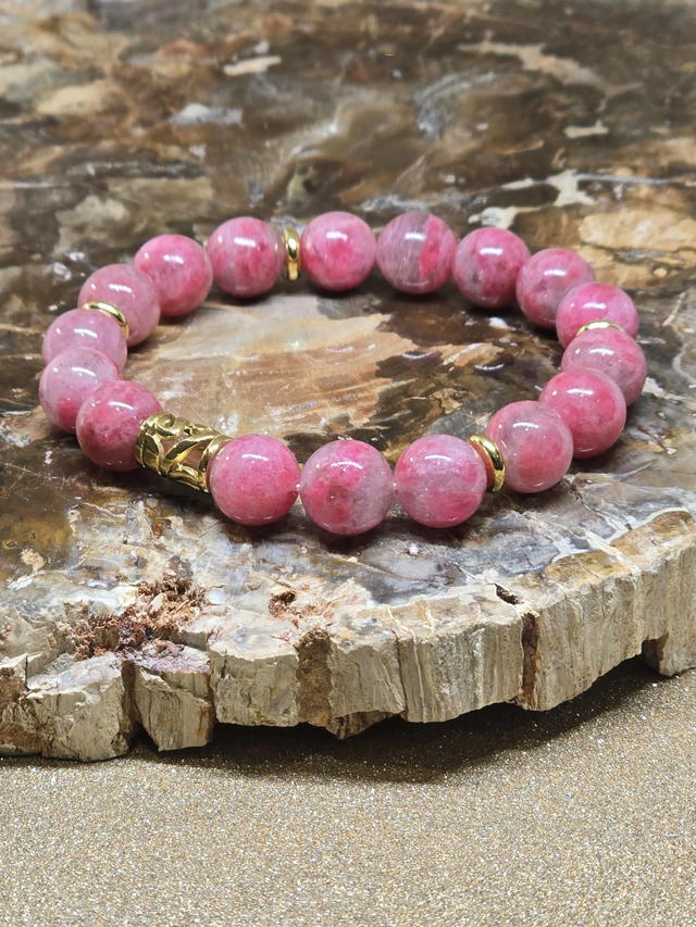 Bracelet fait main sur fil élastique solide composé de Rhodonite qualité AAA du Brésil en 1 cm ainsi que de perles en acier inoxydable doré.