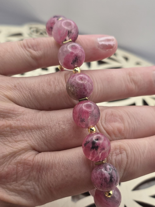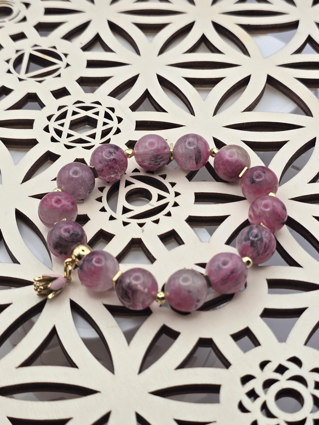 Rhodonite : Chakra cœur, travaille sur les blessures émotionnelles, affectives, chocs émotionnels : deuil, rupture, anciennes blessures émotionnelles non guérit. Aide à vivre dans le moment présent pour vivre des relations plus saines. Elle aide à combattre l'autodestruction émotionnelle en facilitant le pardon. Elle offre une réelle introspection émotionnelle.